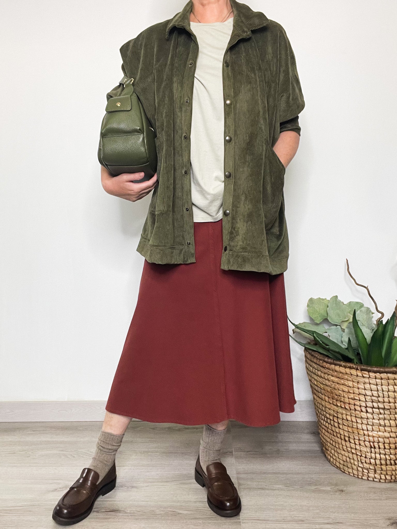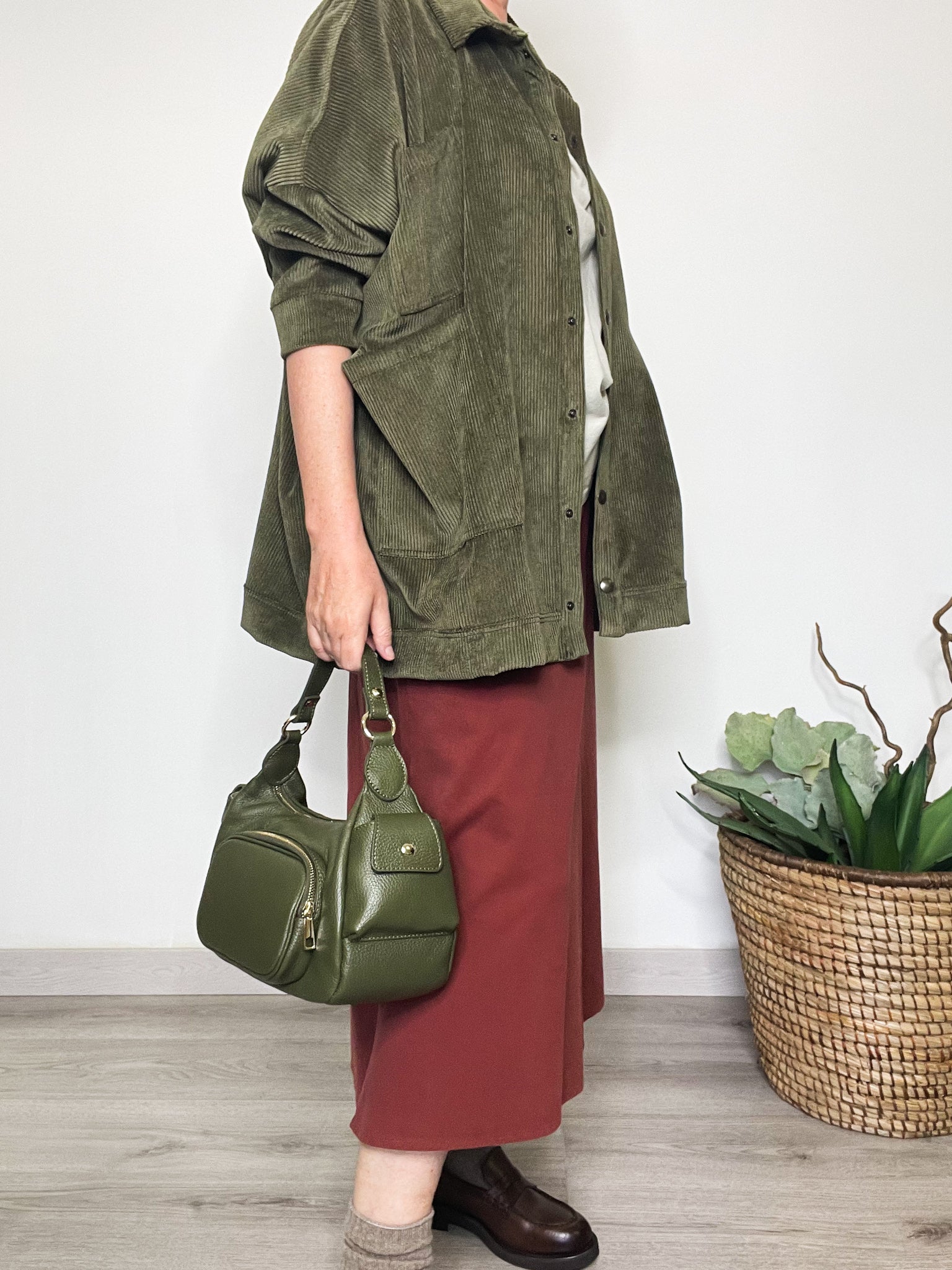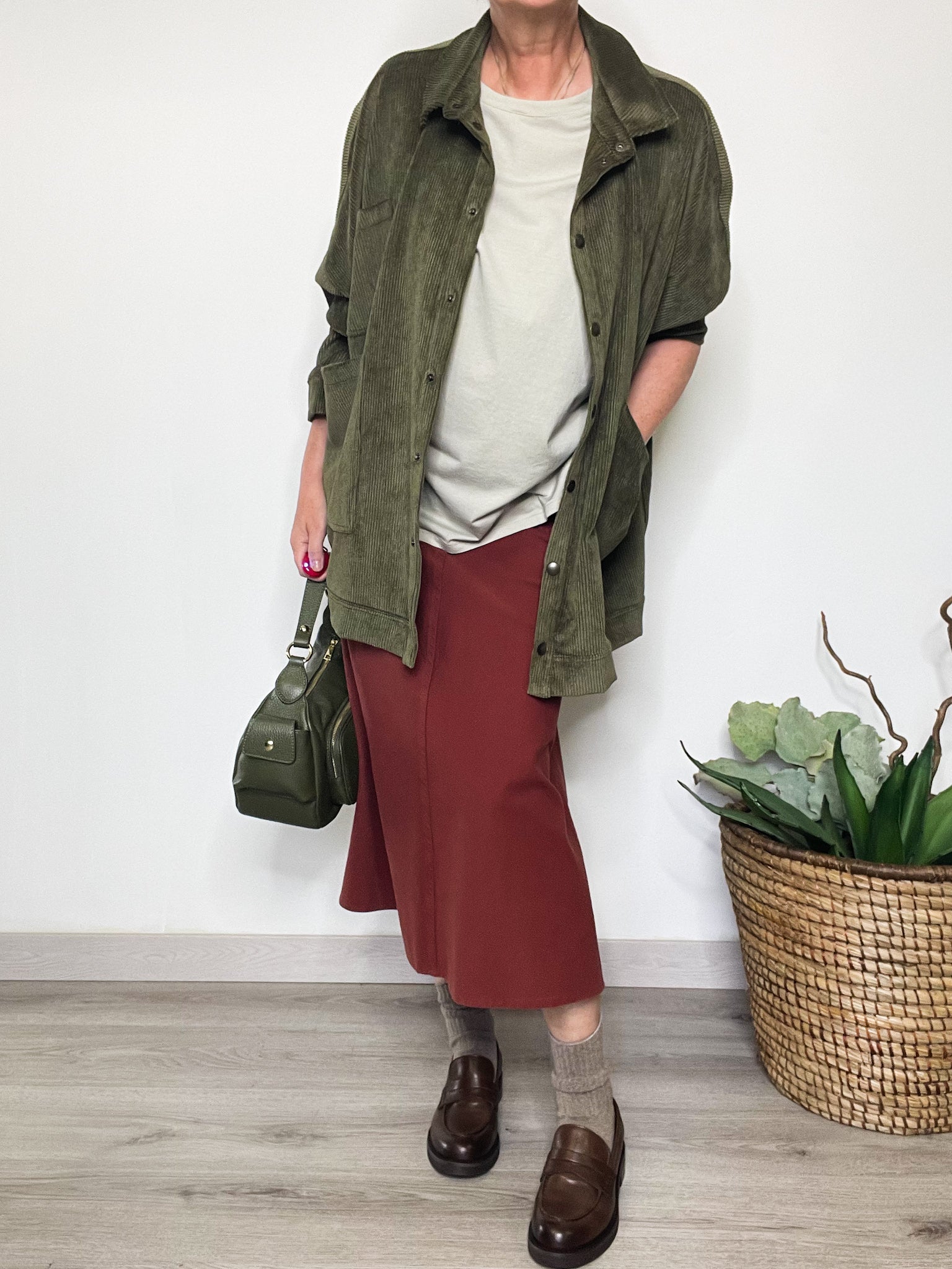 Il tessuto in velluto a coste aggiunge un tocco tattile e raffinato, perfetto per look casual ma curati.