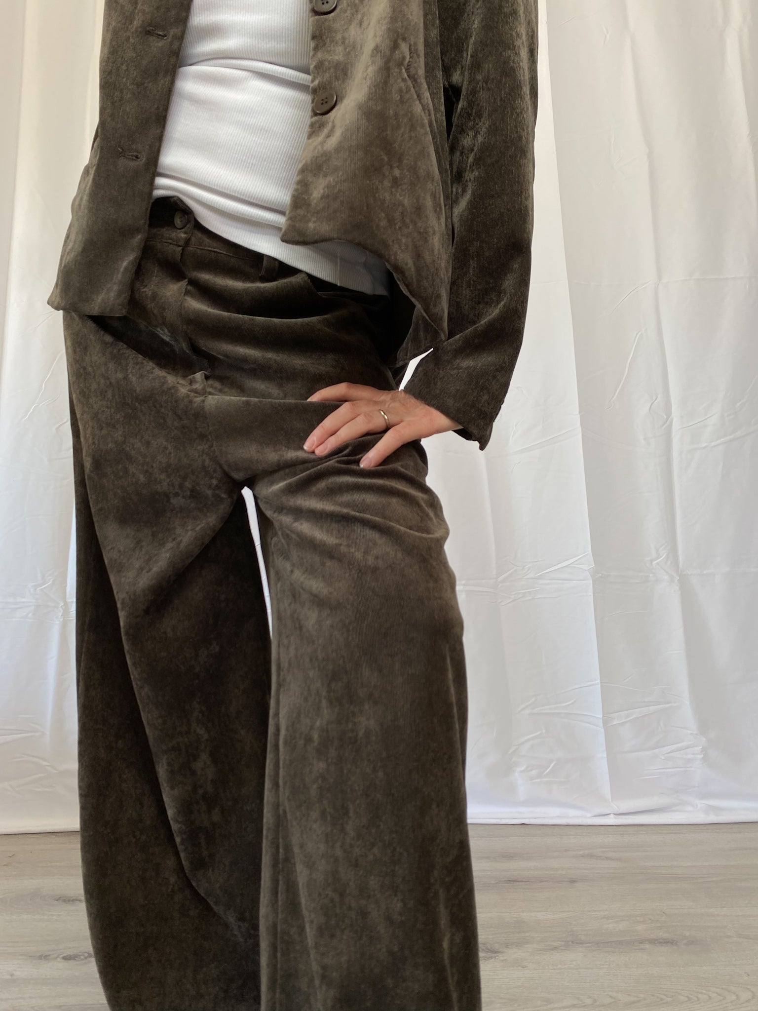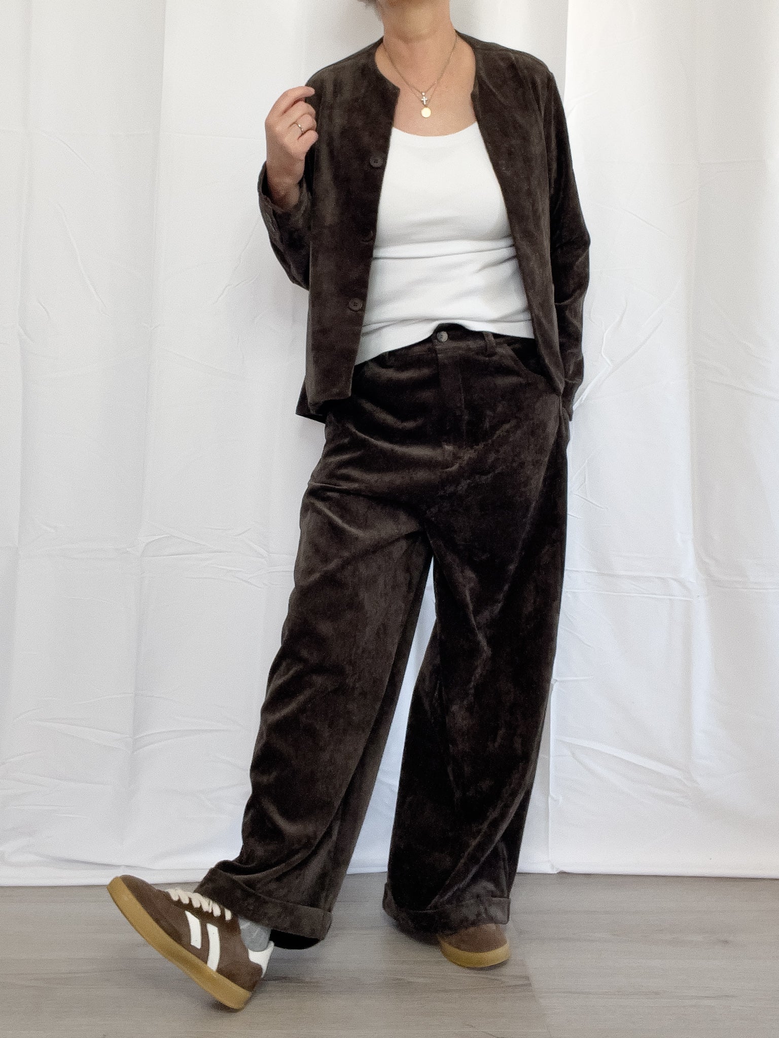Con il pantalone coordinato in vellutino per un total look sofisticato.