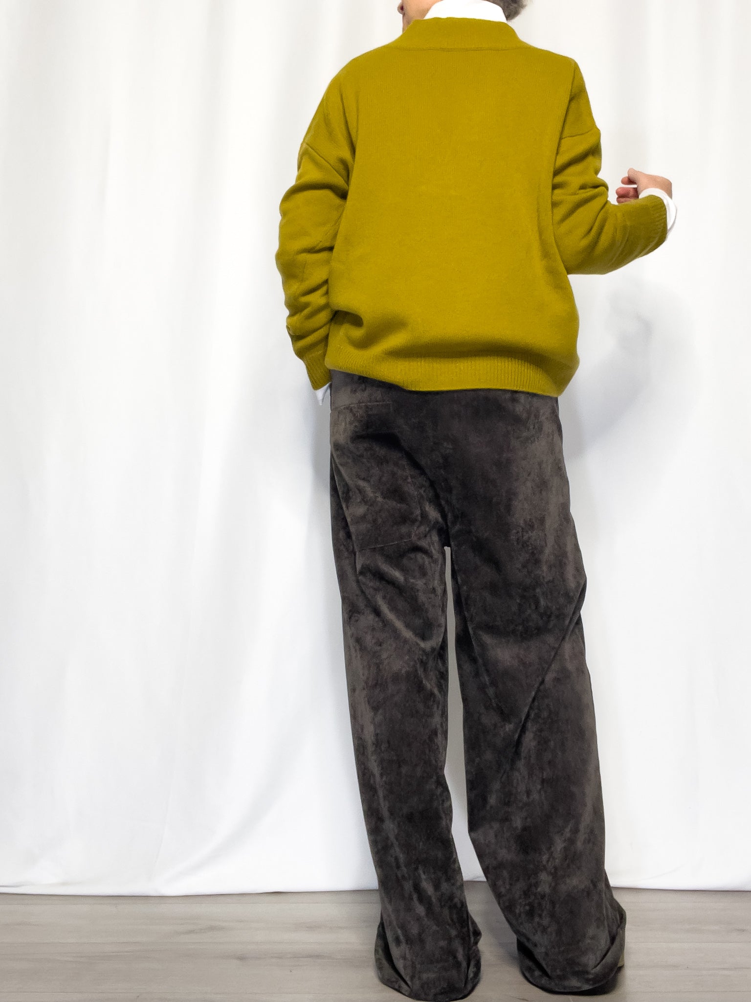 Questo pantalone in vellutino a coste sottili ha un aspetto raffinato ma rilassato, con una texture morbida che cattura la luce e accompagna il movimento. Il fit over e la gamba ampia offrono libertà e fluidità, mentre la tasca posteriore bassa, posizionata tra il gluteo e la coscia, aggiunge un dettaglio funzionale e contemporaneo.