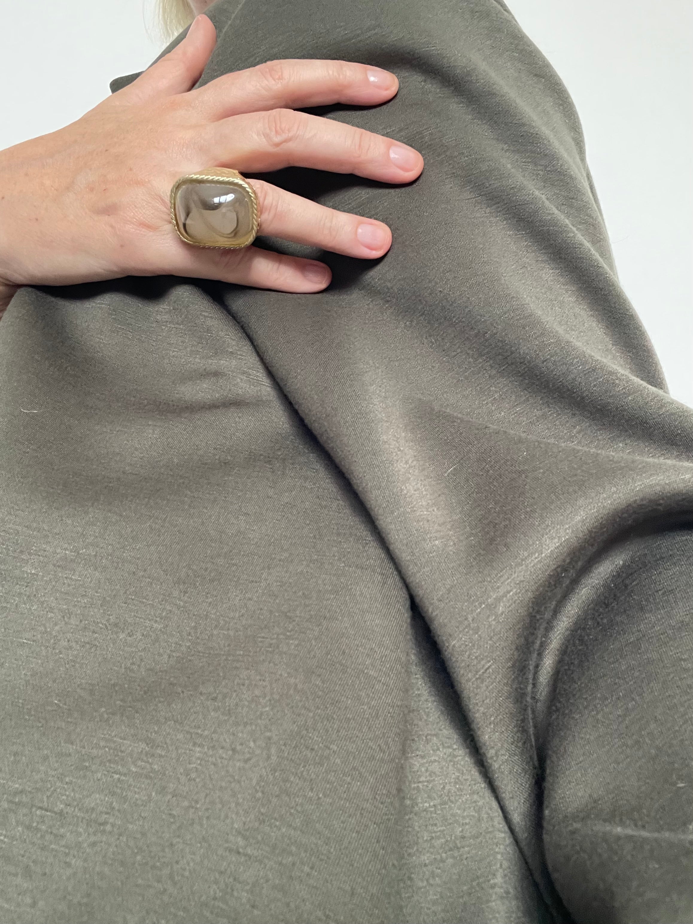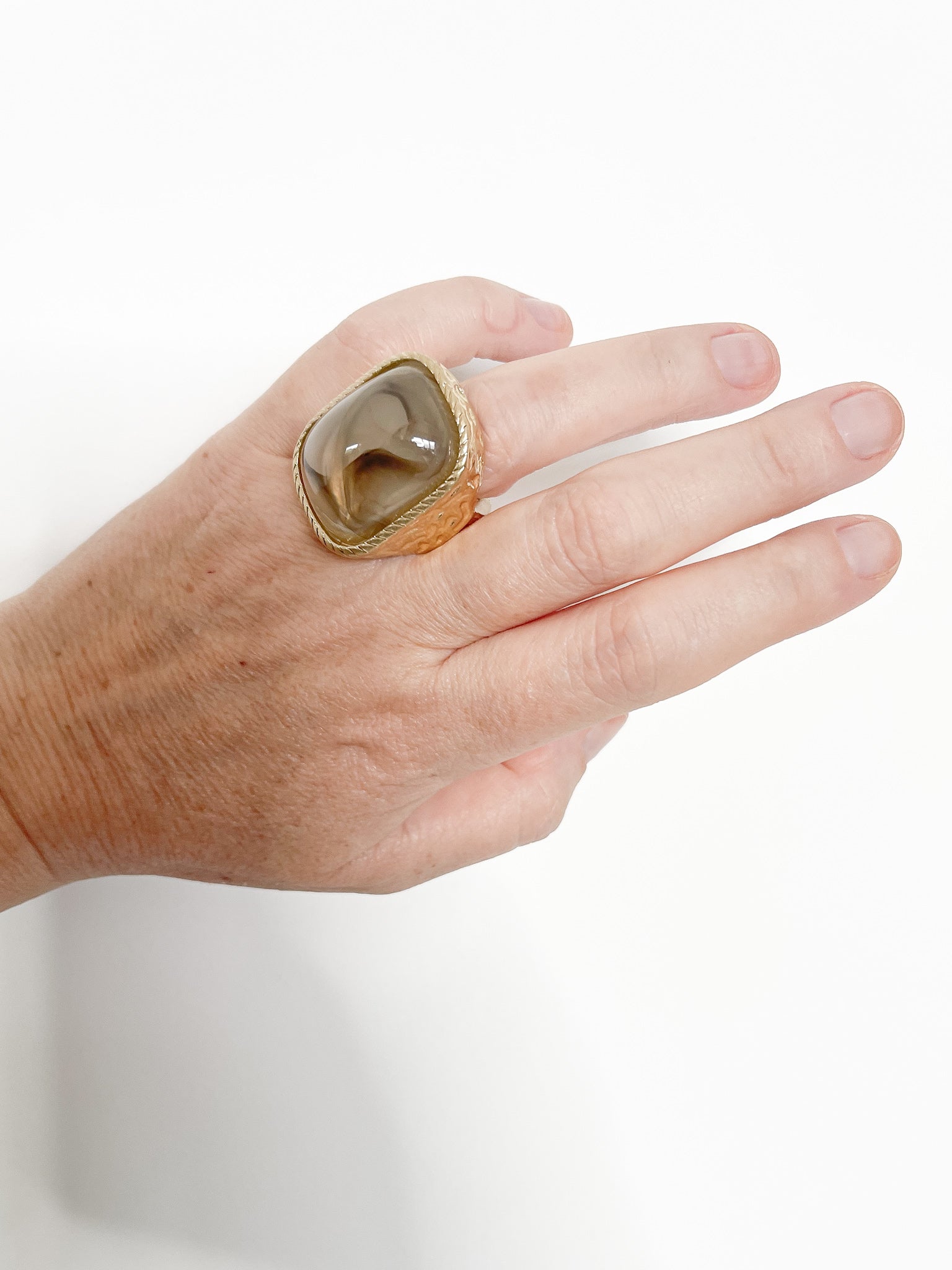 Un accessorio d’impatto che aggiunge personalità a ogni look. Questo anello si distingue per la grande pietra ovale effetto cabochon, dalle sfumature naturali che catturano la luce. La montatura in metallo dorato incornicia la pietra con linee morbide e geometriche, creando un equilibrio tra forza e femminilità.
