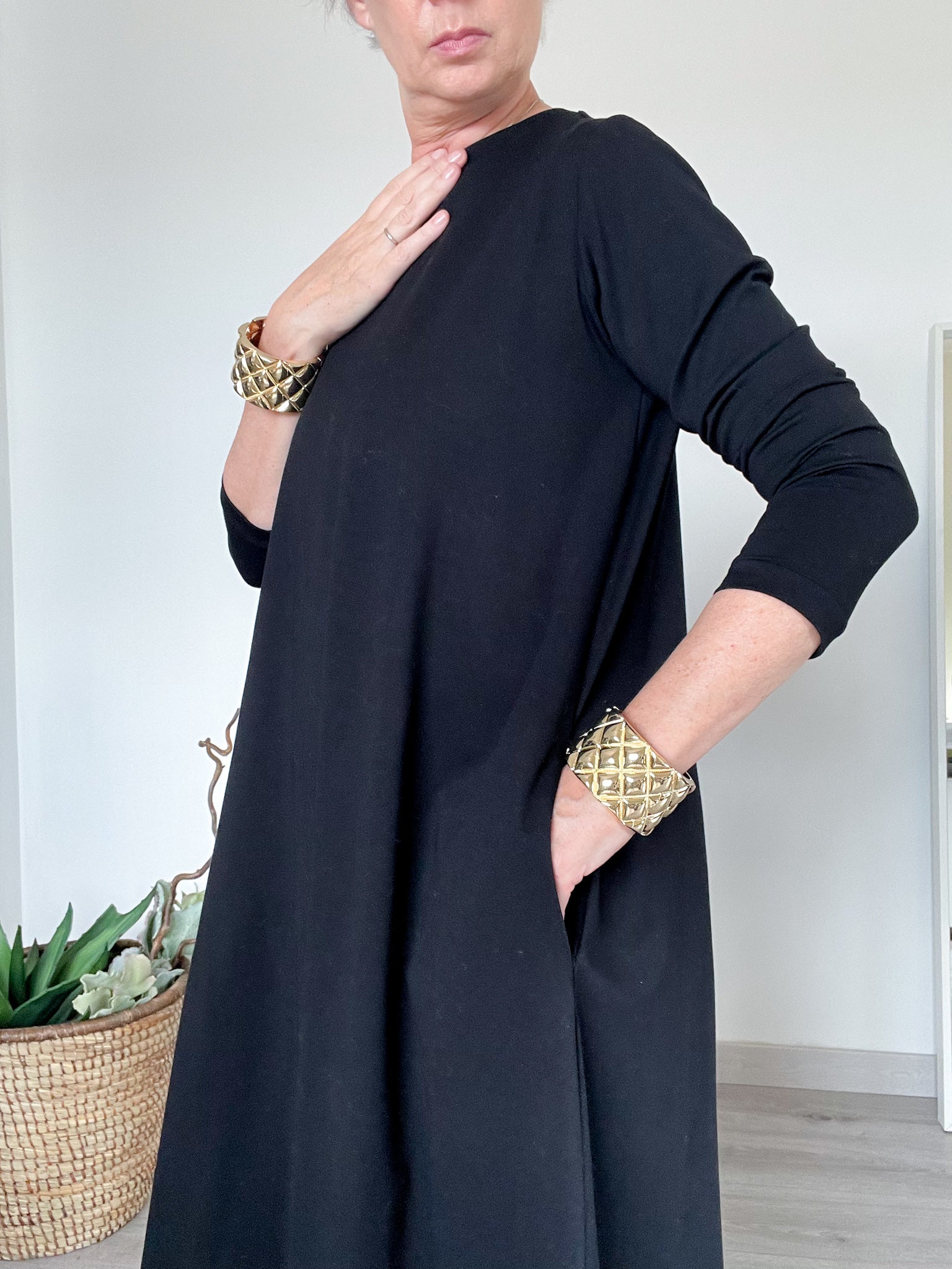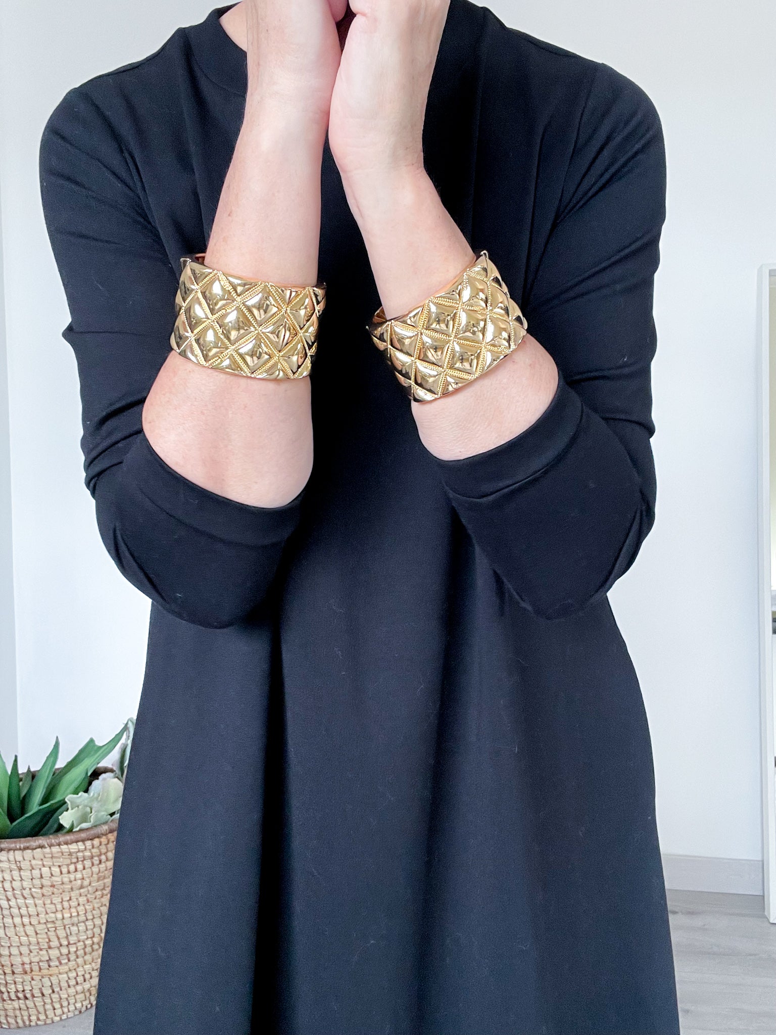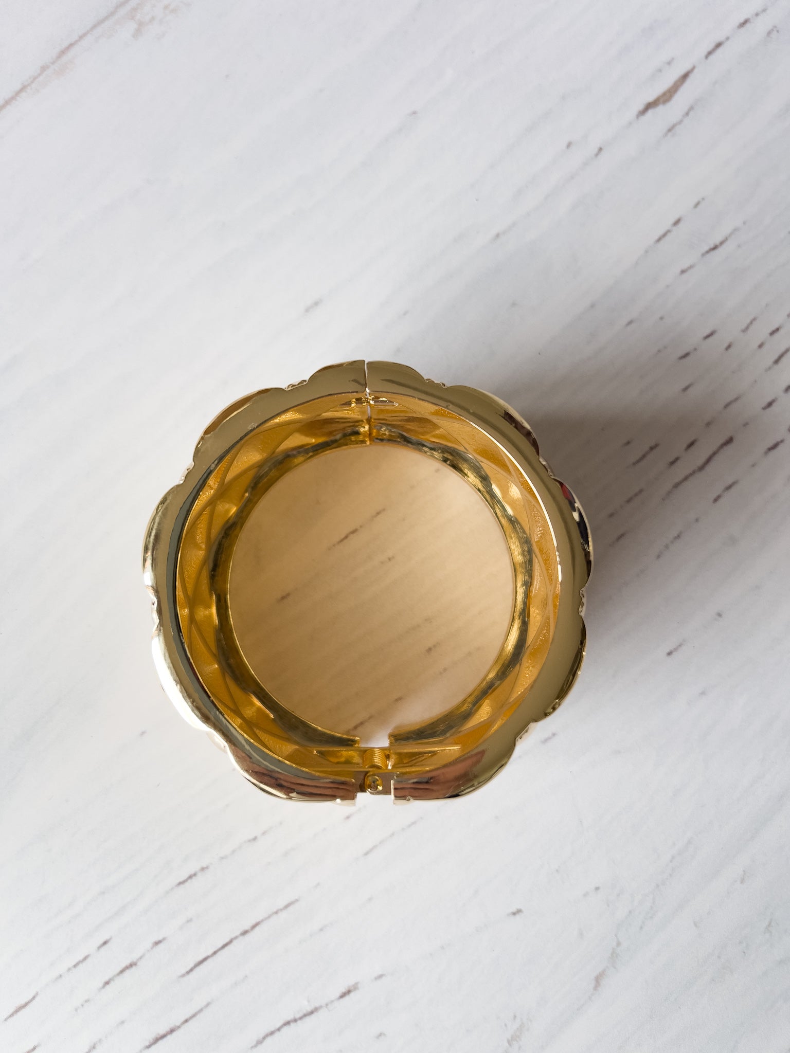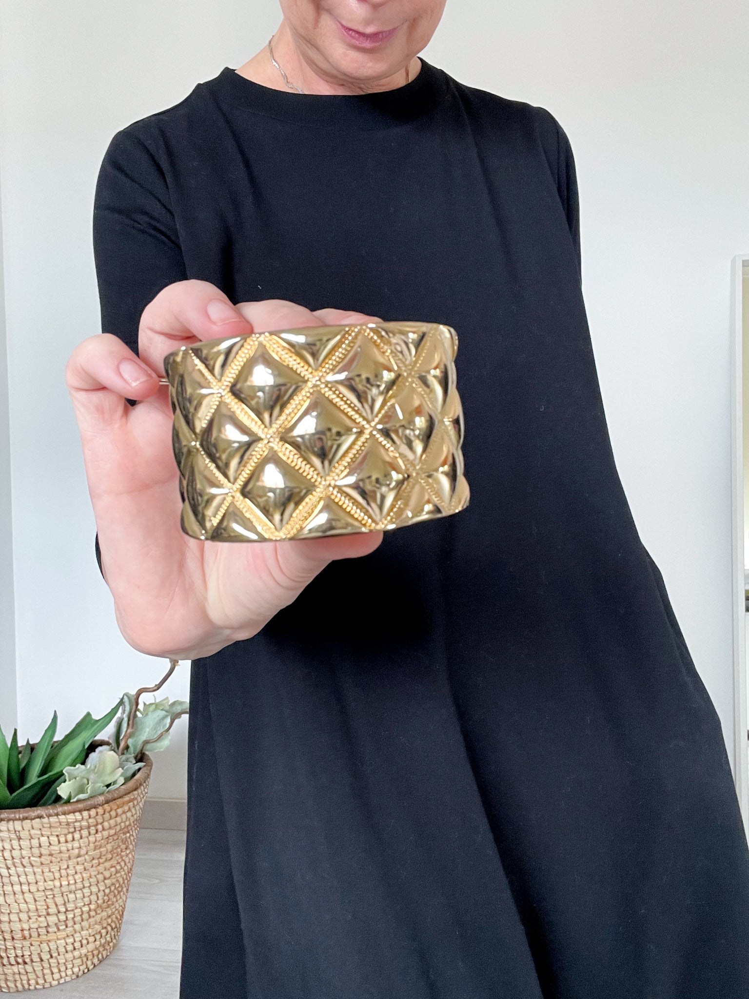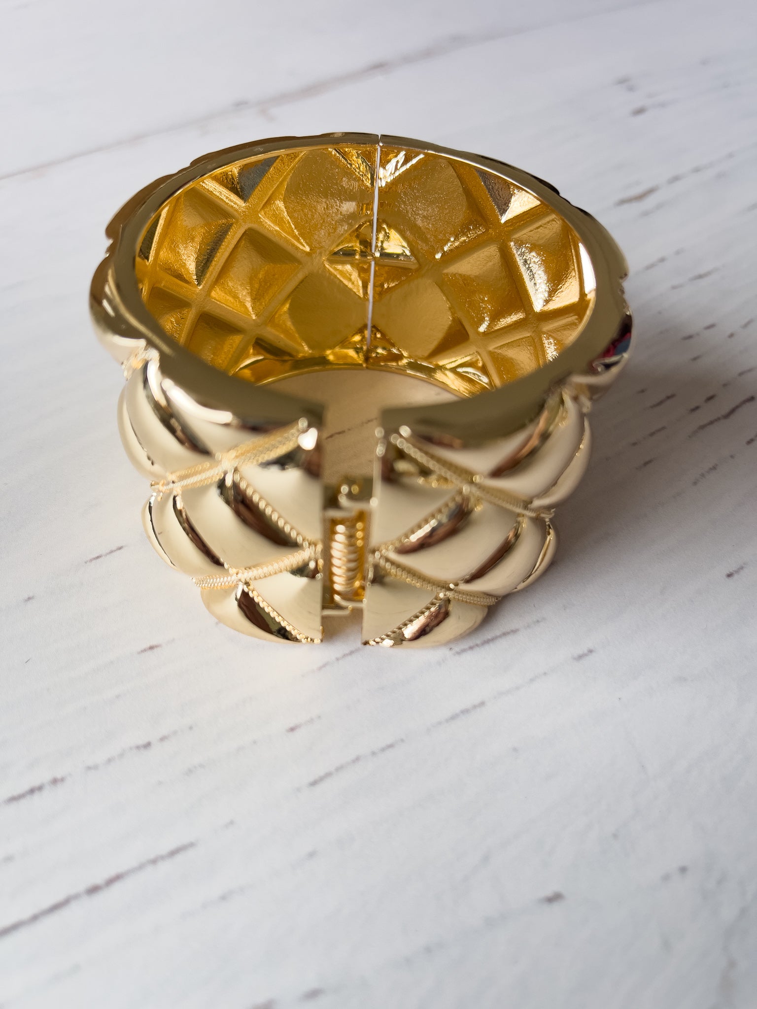 Realizzato in metallo dorato con lavorazione a rilievo effetto trapuntato, questo bracciale rigido è leggero ma d’impatto.