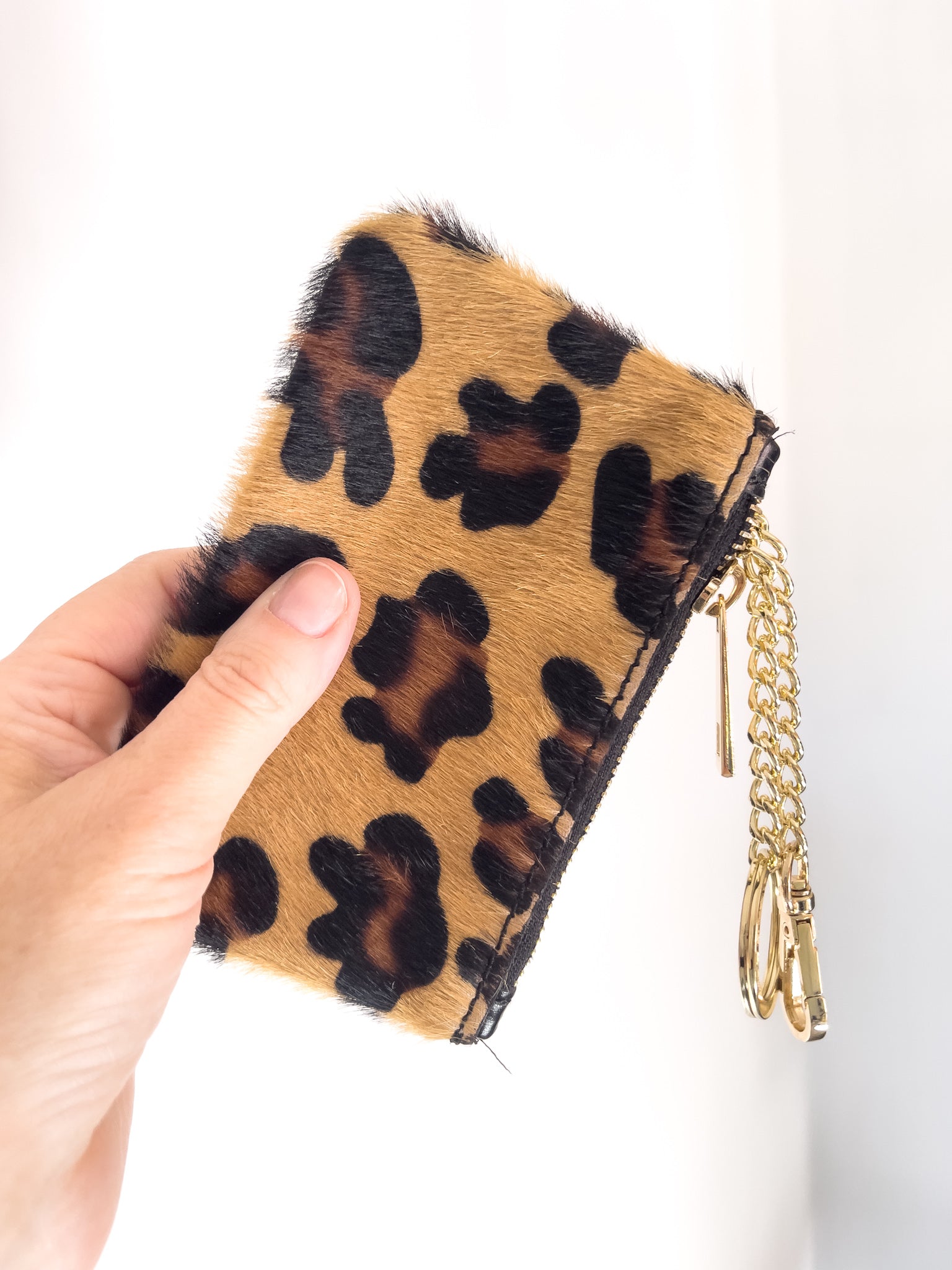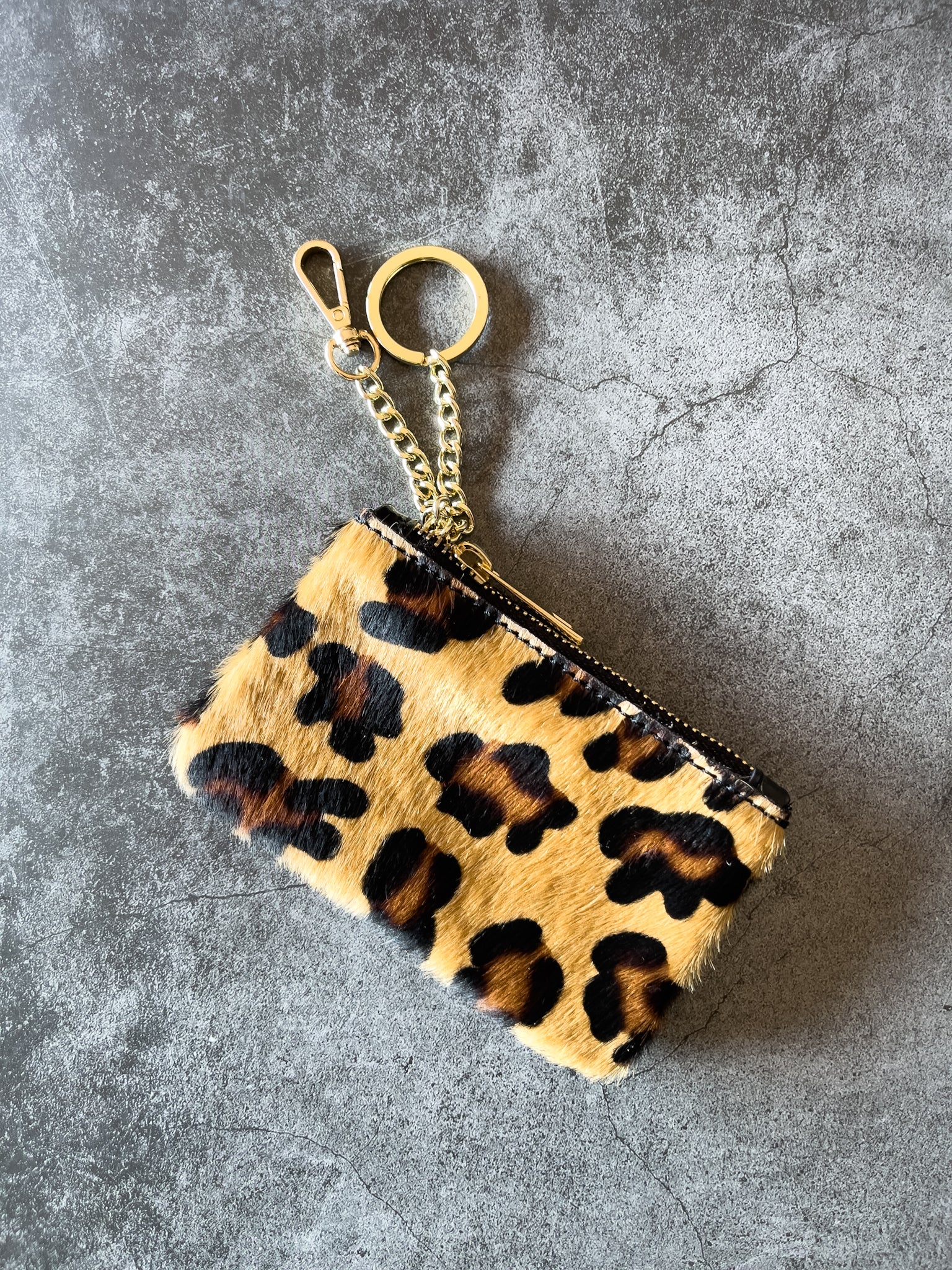 Compatto, funzionale e grintoso: questo portachiavi in vera pelle con finitura cavallino si distingue per la stampa leopardata che aggiunge carattere a ogni dettaglio.