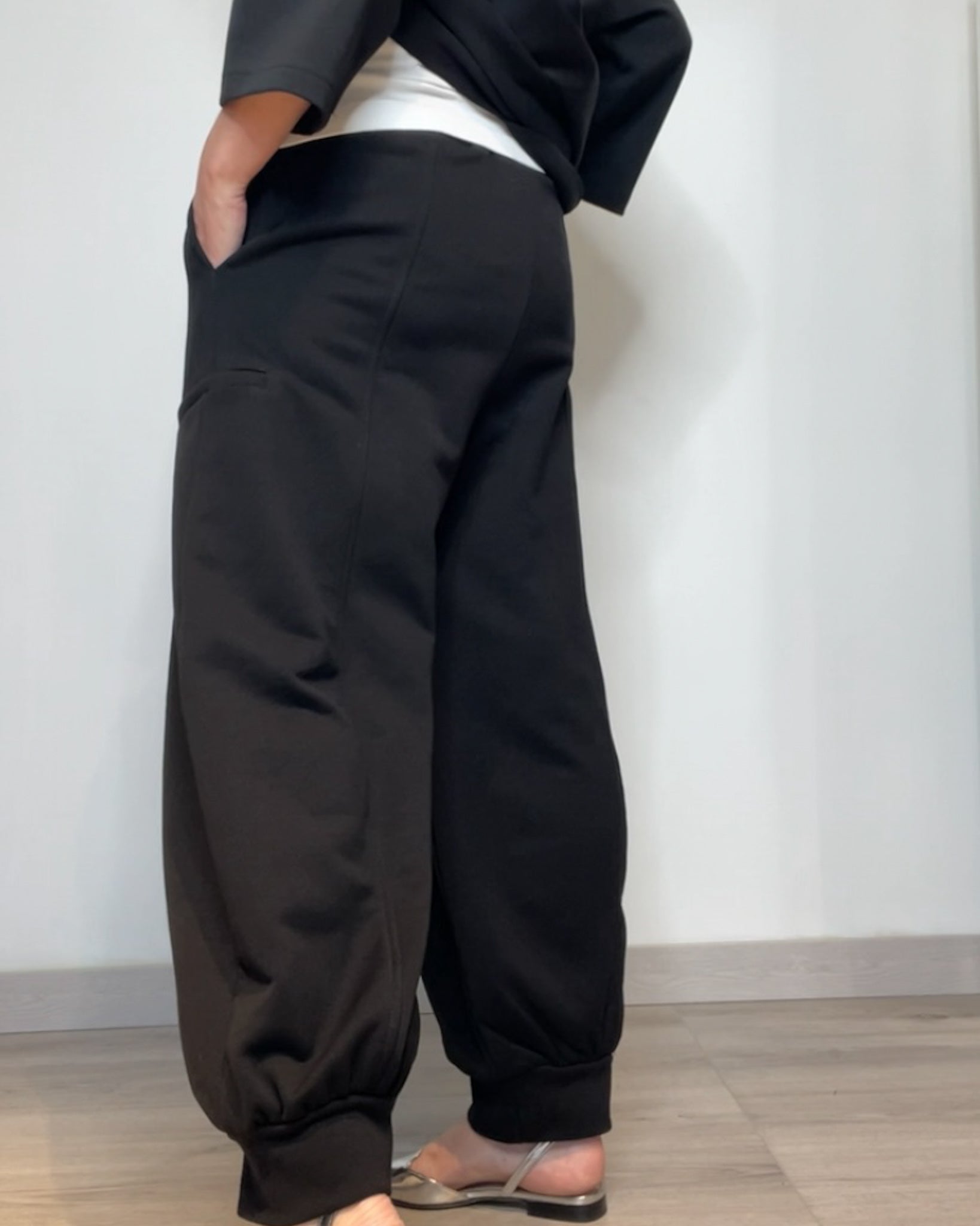 La linea è ampia, con gamba arrotondata e fondo raccolto effetto polsino che crea un effetto balloon moderno e strutturato. La felpa di cotone ha corpo, sostiene la forma e accompagna il movimento senza cedere.