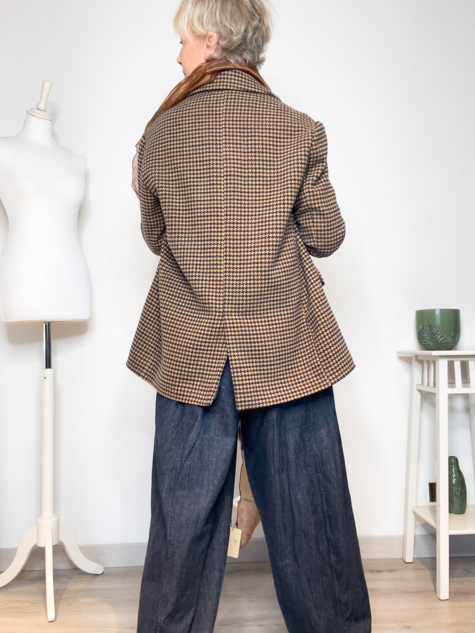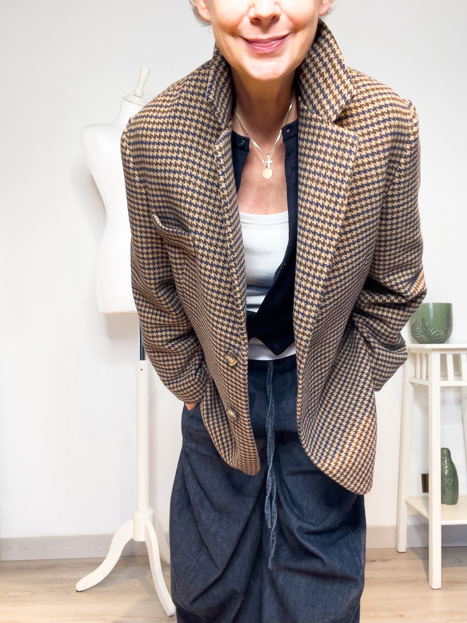 Questo blazer in tessuto pied de poule unisce la tradizione del motivo inglese a una linea morbida e rilassata, che dona carattere senza rinunciare al comfort. Il taglio over, destrutturato e leggermente maschile, lo rende un capo versatile da indossare in mille modi: su denim, abiti fluidi o pantaloni sartoriali.