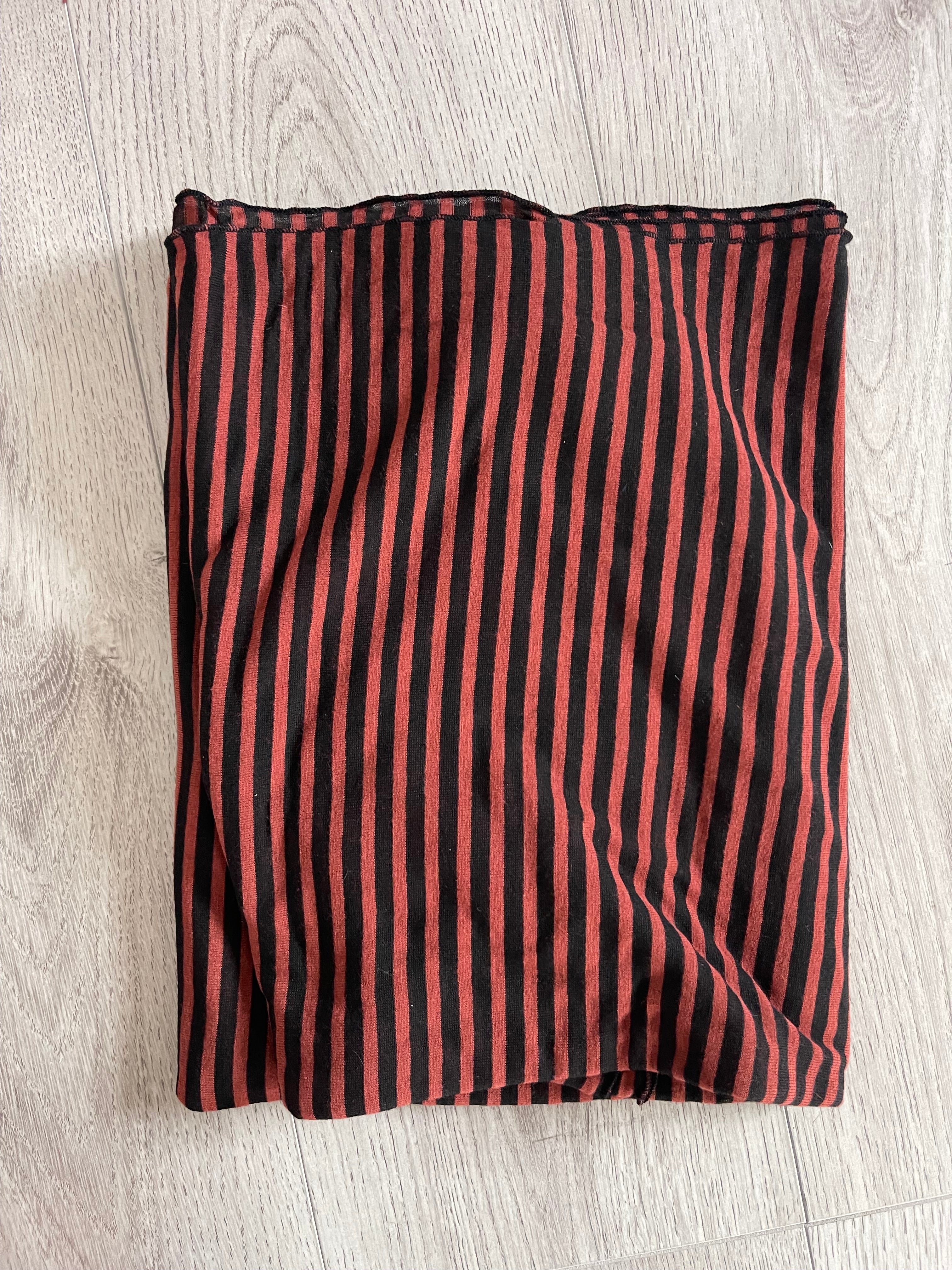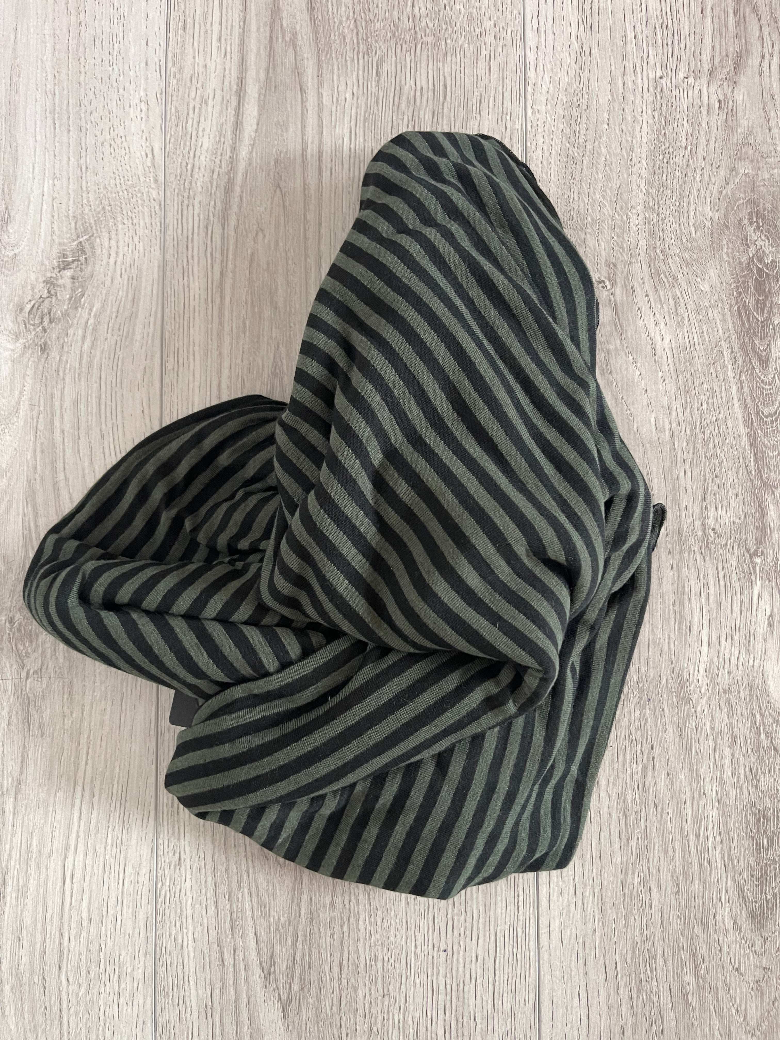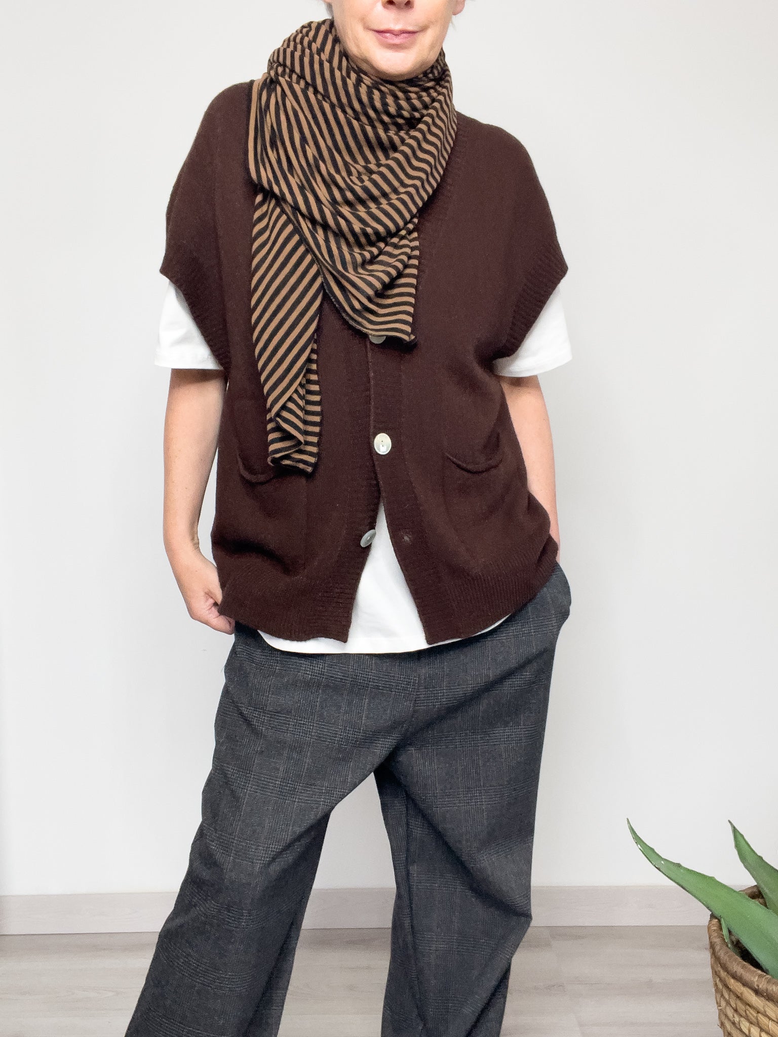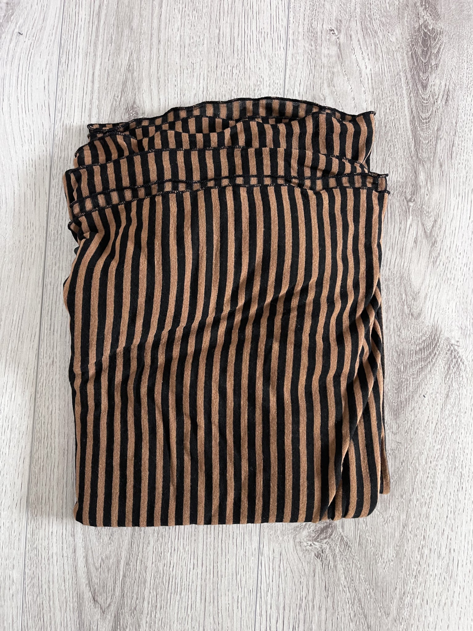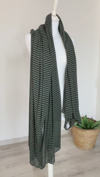 Il motivo a righe sottili bianche e nere dona un tocco contemporaneo e versatile, facile da abbinare sia a look monocromatici che a stampe a contrasto. Le dimensioni generose permettono di indossarla in modi diversi: avvolta più volte attorno al collo per un effetto cozy, oppure lasciata morbida per un’allure più elegante o ancora portata come uno scialle.