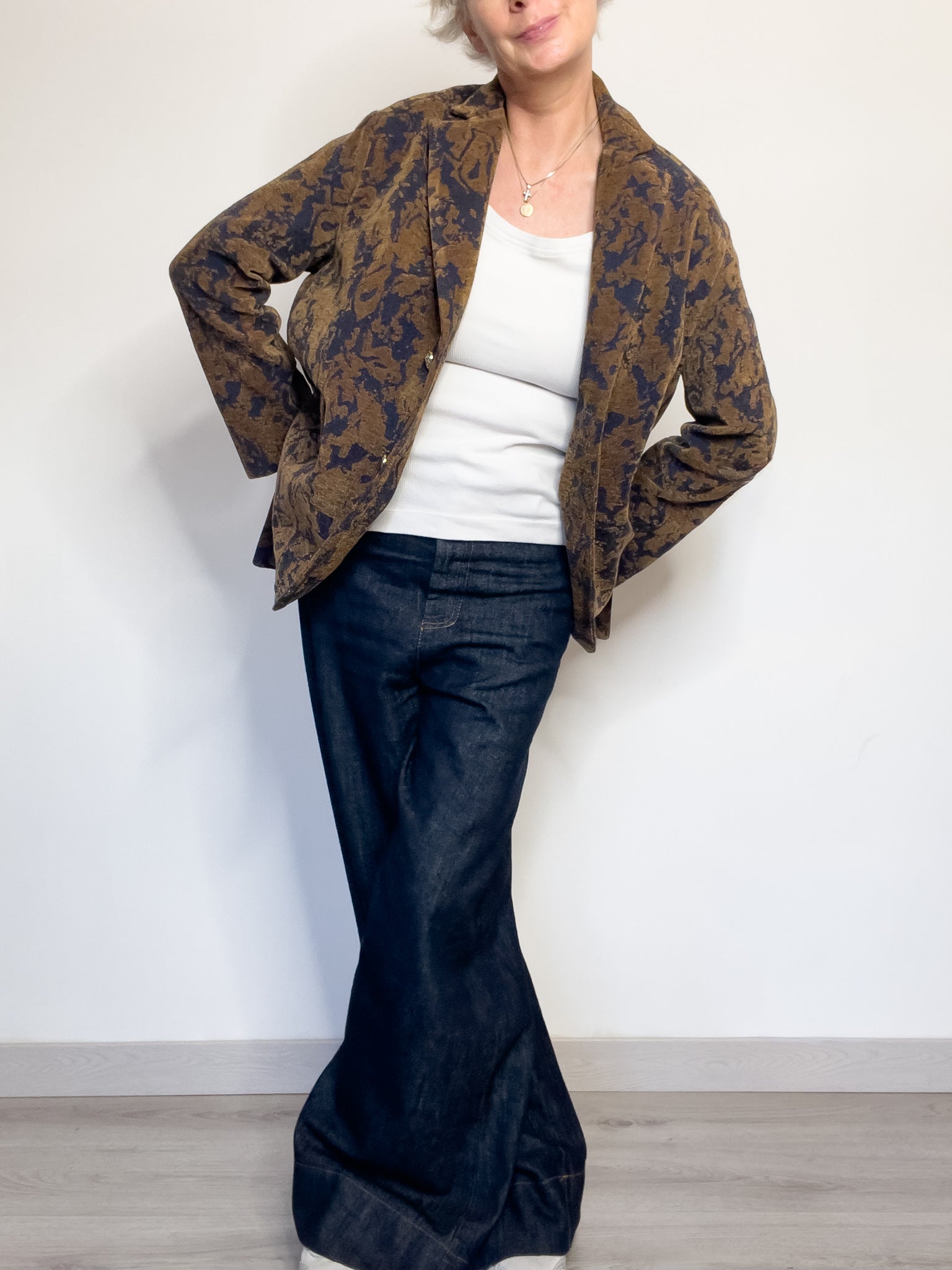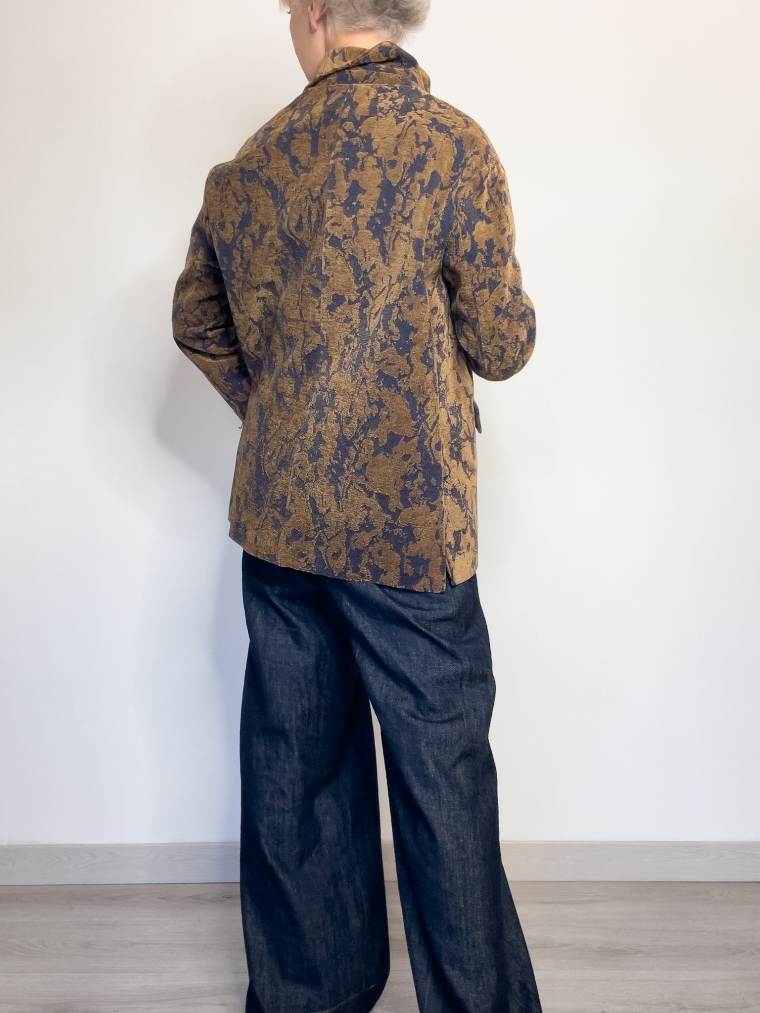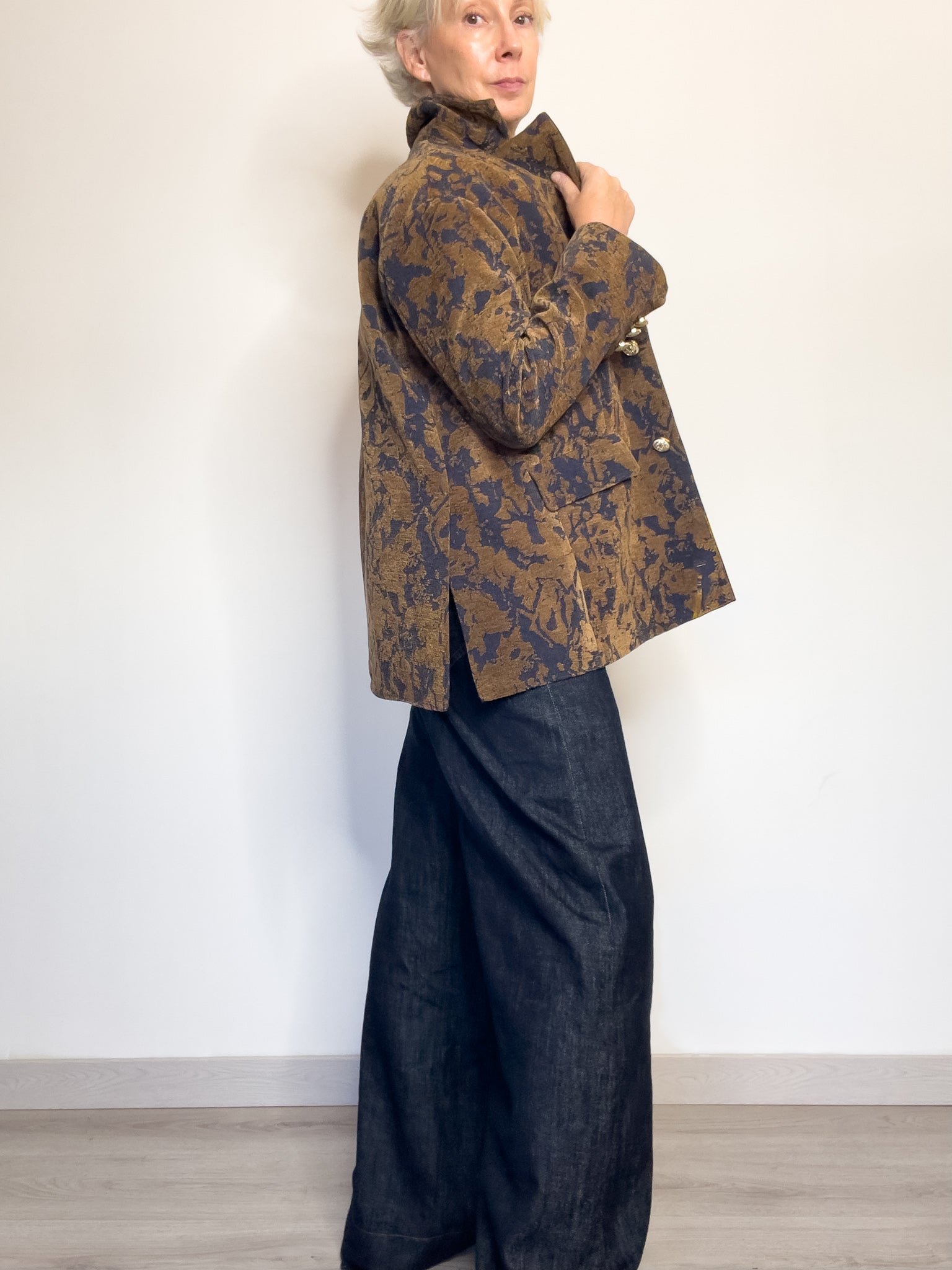 Questa giacca in tessuto devoré effetto damascato unisce l’eleganza della lavorazione jacquard alla leggerezza delle parti più sottili, creando un disegno raffinato che ricorda i tessuti d’arredo preziosi.