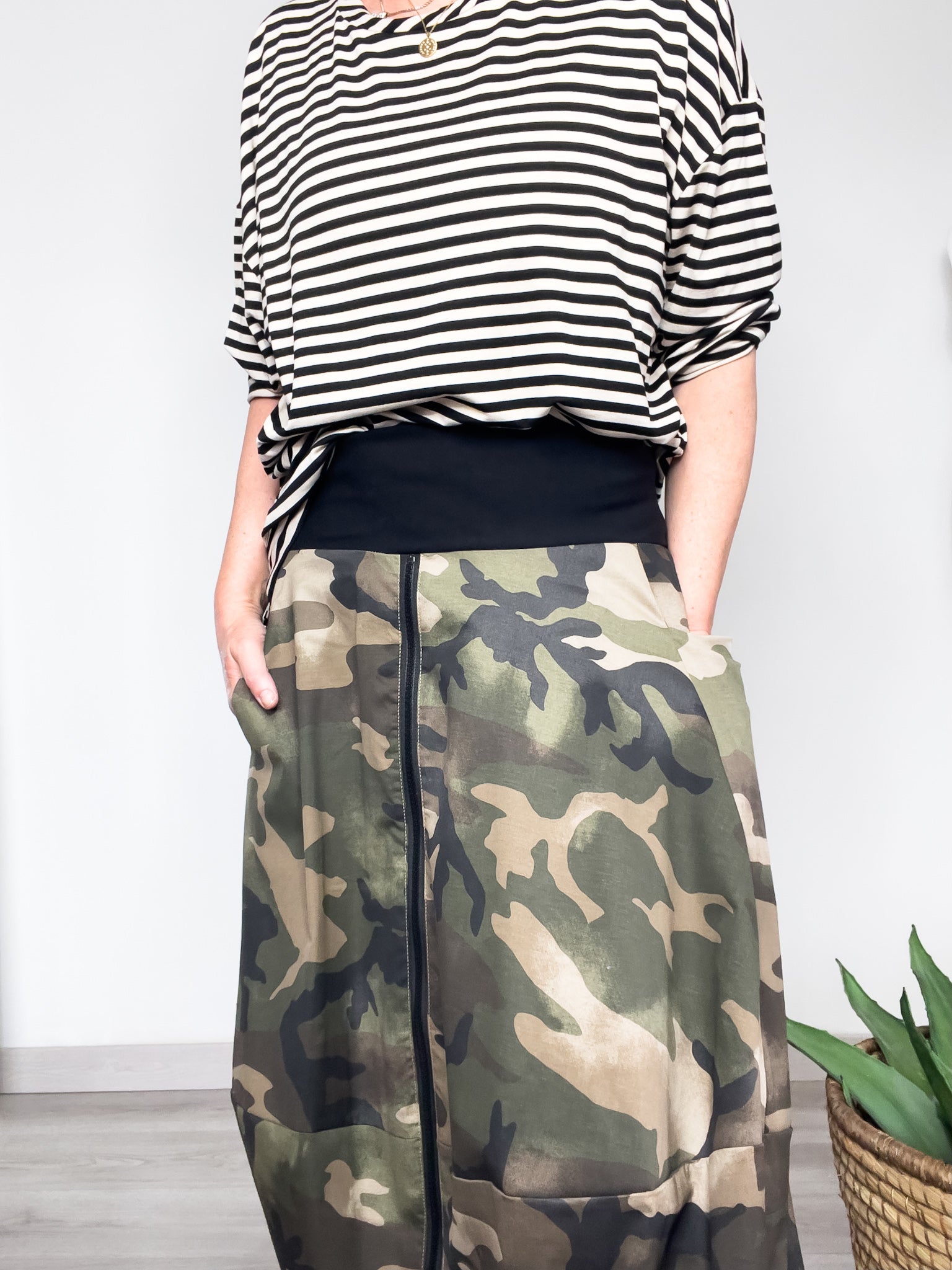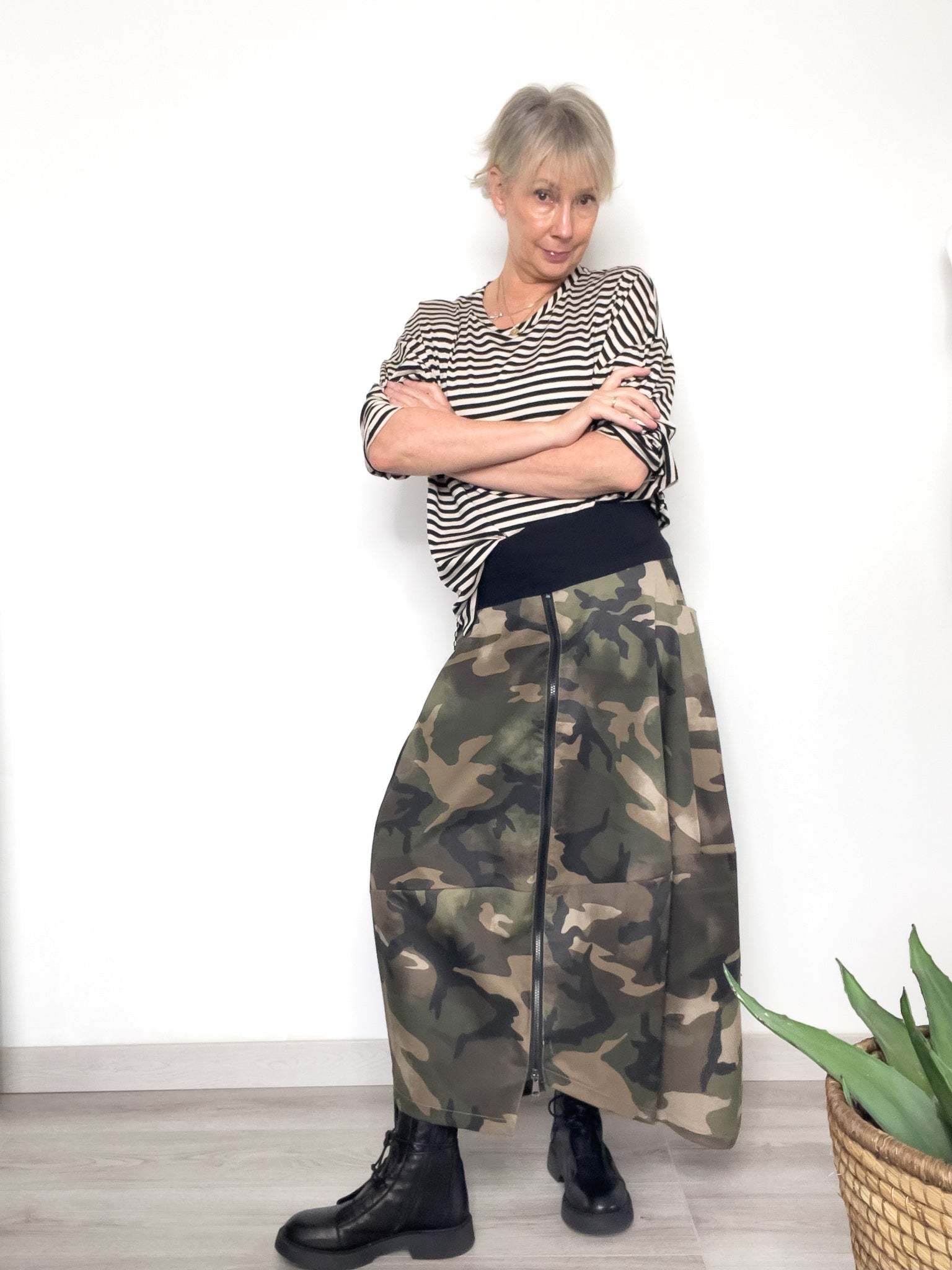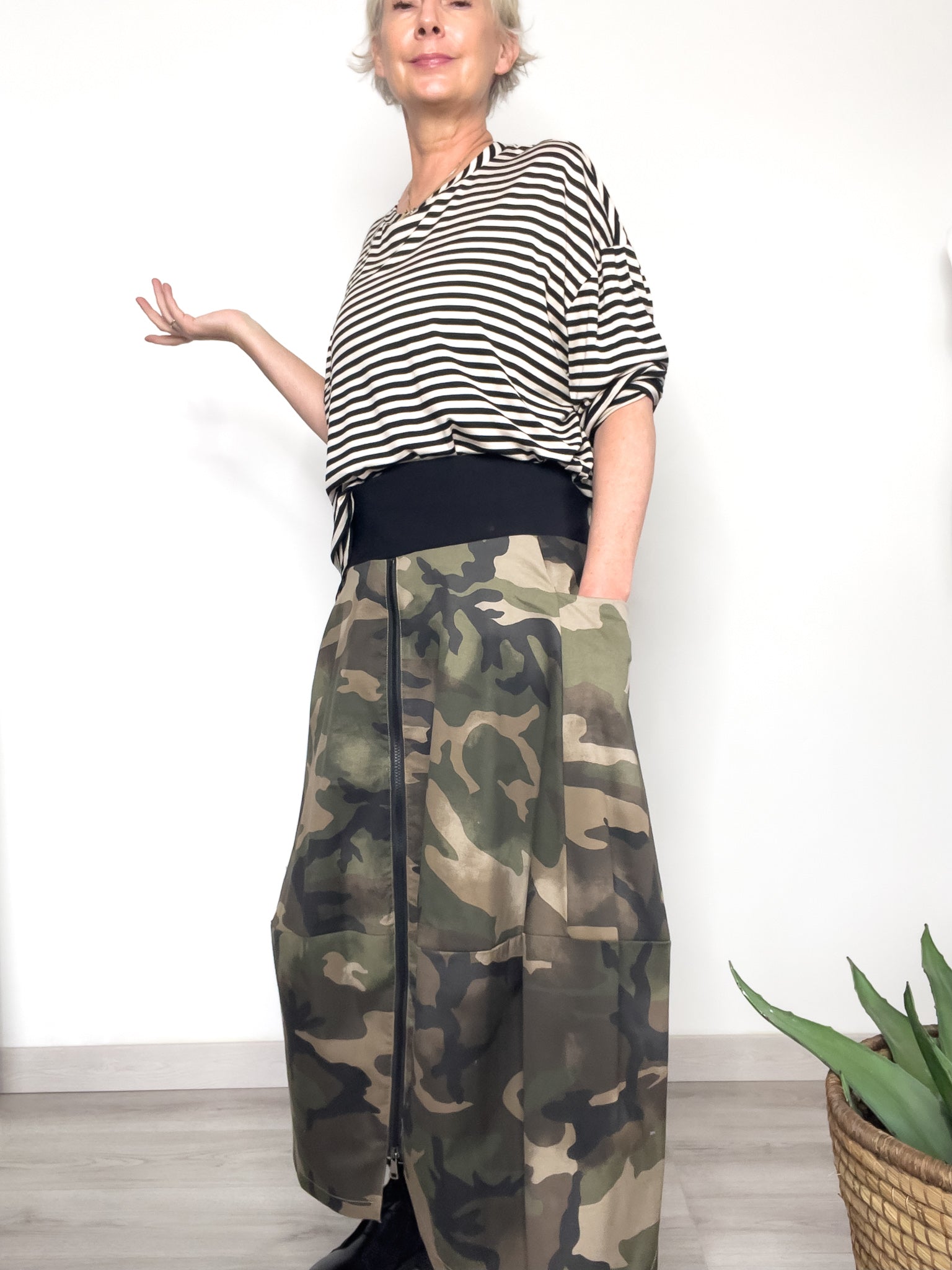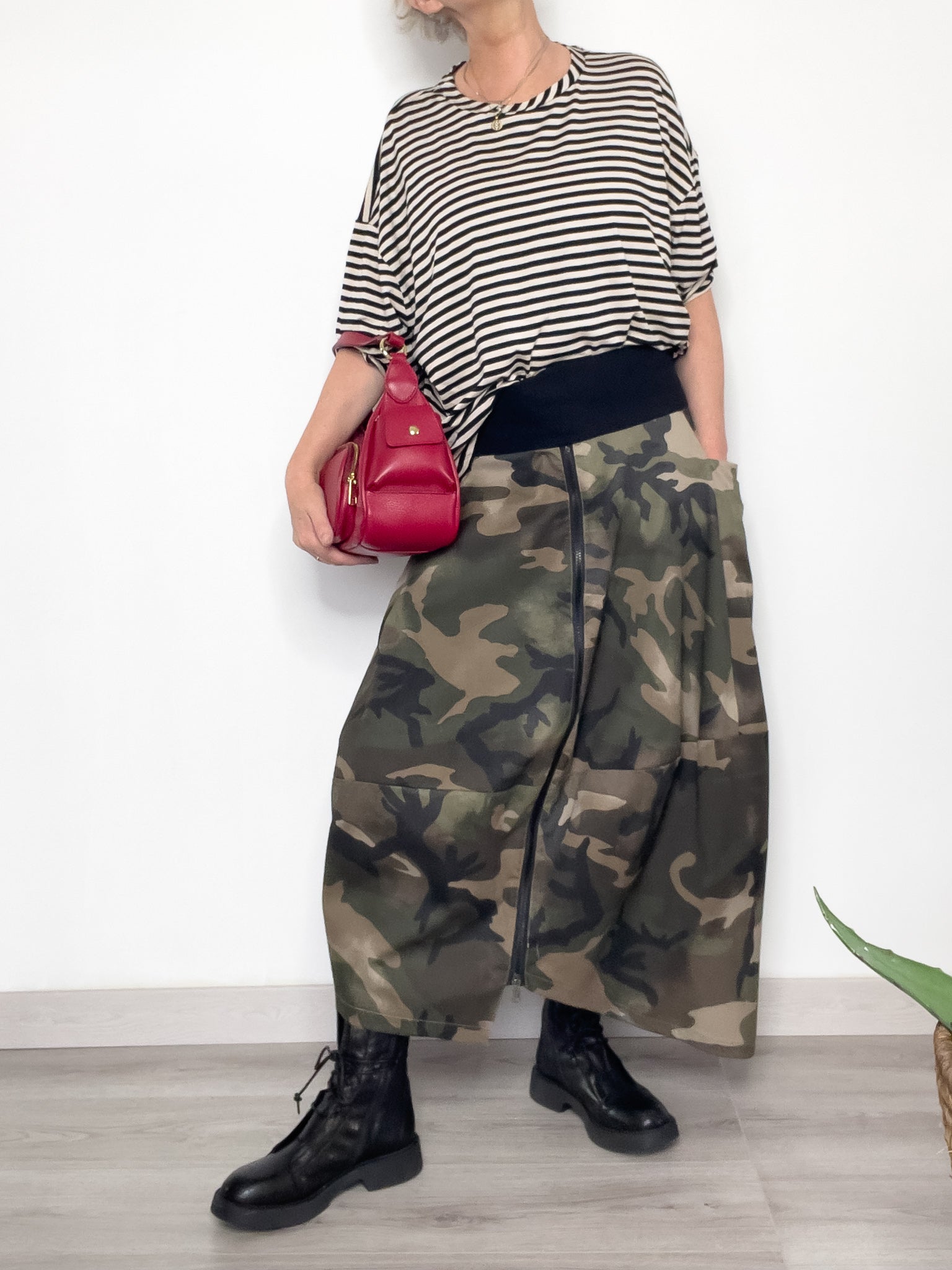 La gonna in fantasia camouflage reinterpreta la femminilità con una silhouette a palloncino, morbida e strutturata, che regala movimento ad ogni passo. La zip frontale leggermente asimmetrica aggiunge un dettaglio urban-chic, mentre la fascia elasticizzata in vita garantisce praticità, comfort e vestibilità perfetta.