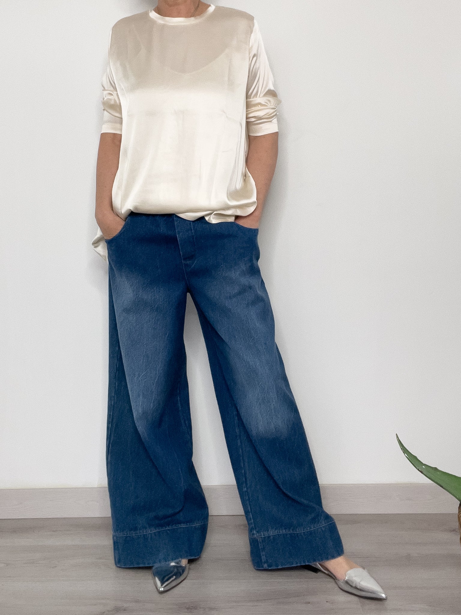 Il lavaggio a pietra centrale accentua l’effetto ottico slanciato, rendendolo ancora più femminile.