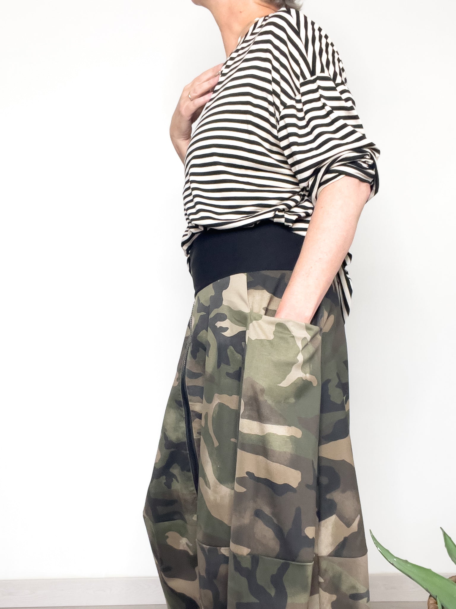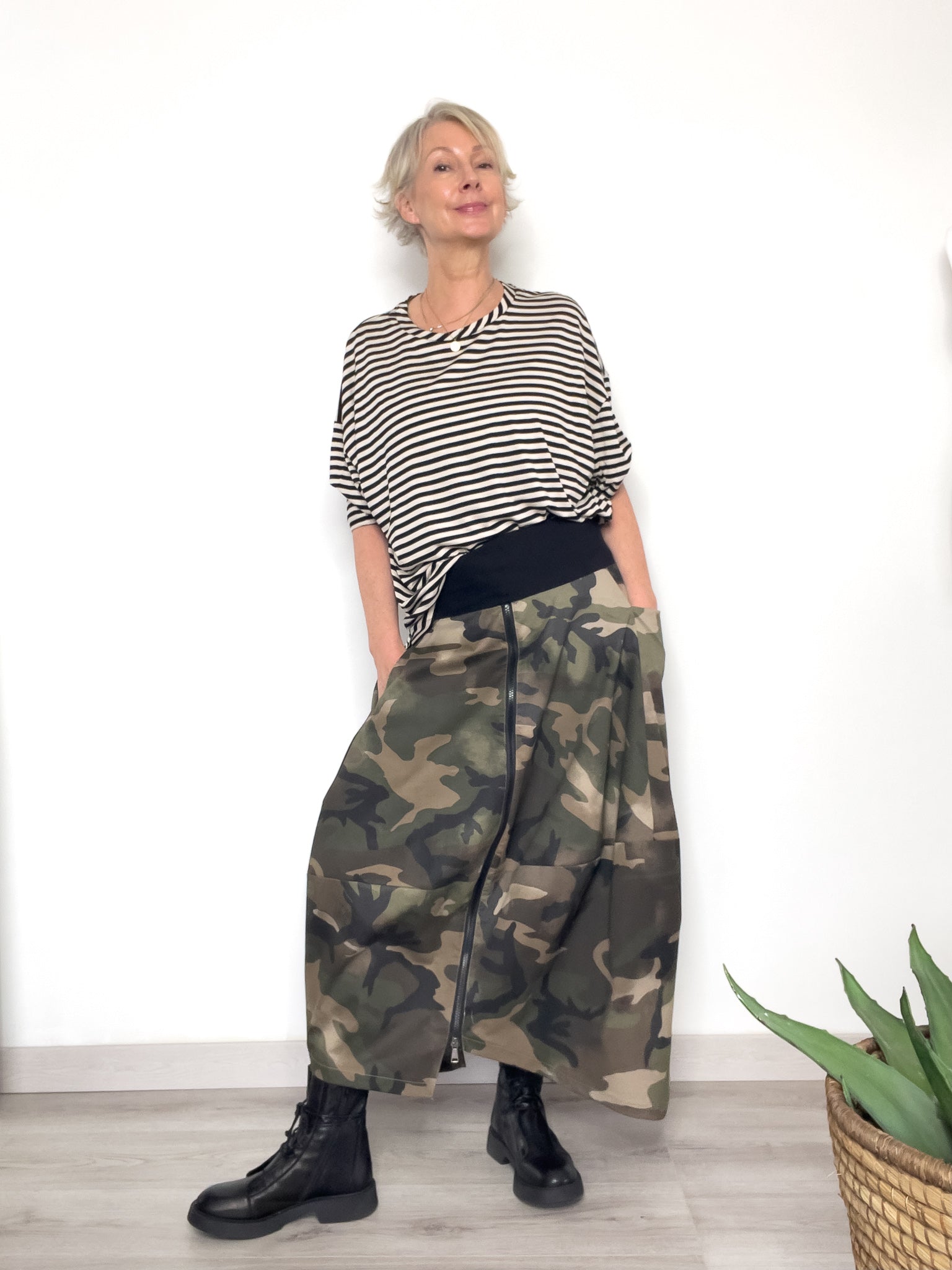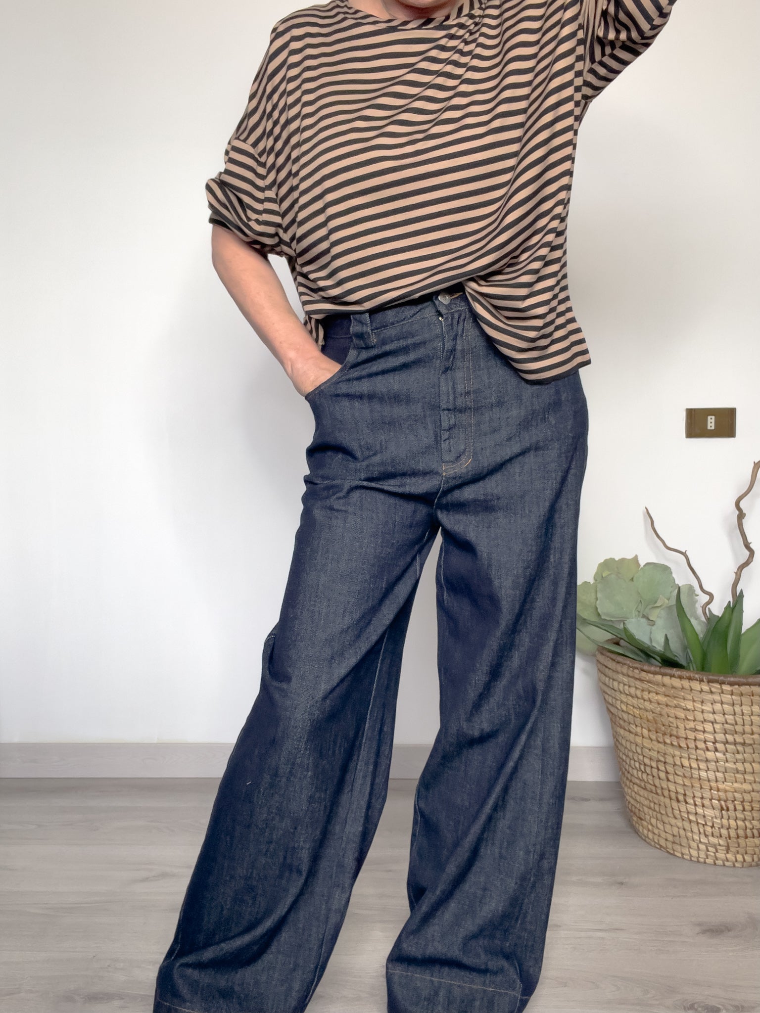 Il motivo a righe dona carattere grafico senza tempo, facile da abbinare a jeans, gonne o pantaloni ampi. Perfetta sia portata dentro al pantalone che lasciata libera per un effetto più rilassato.