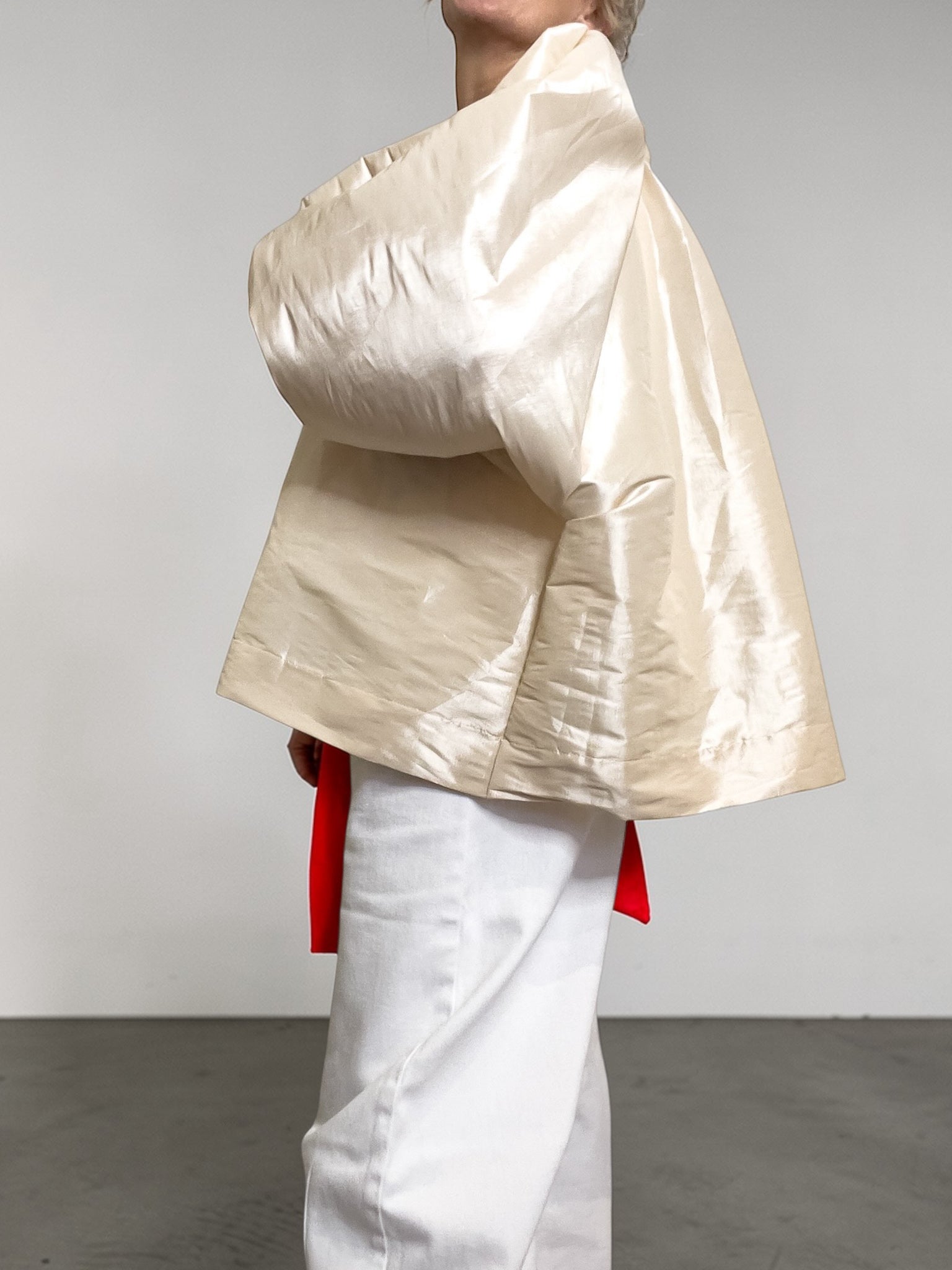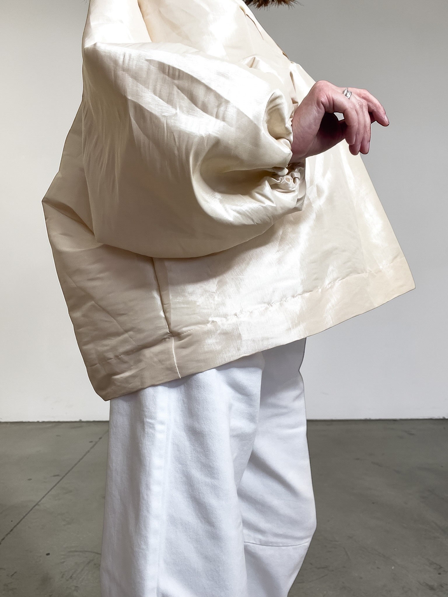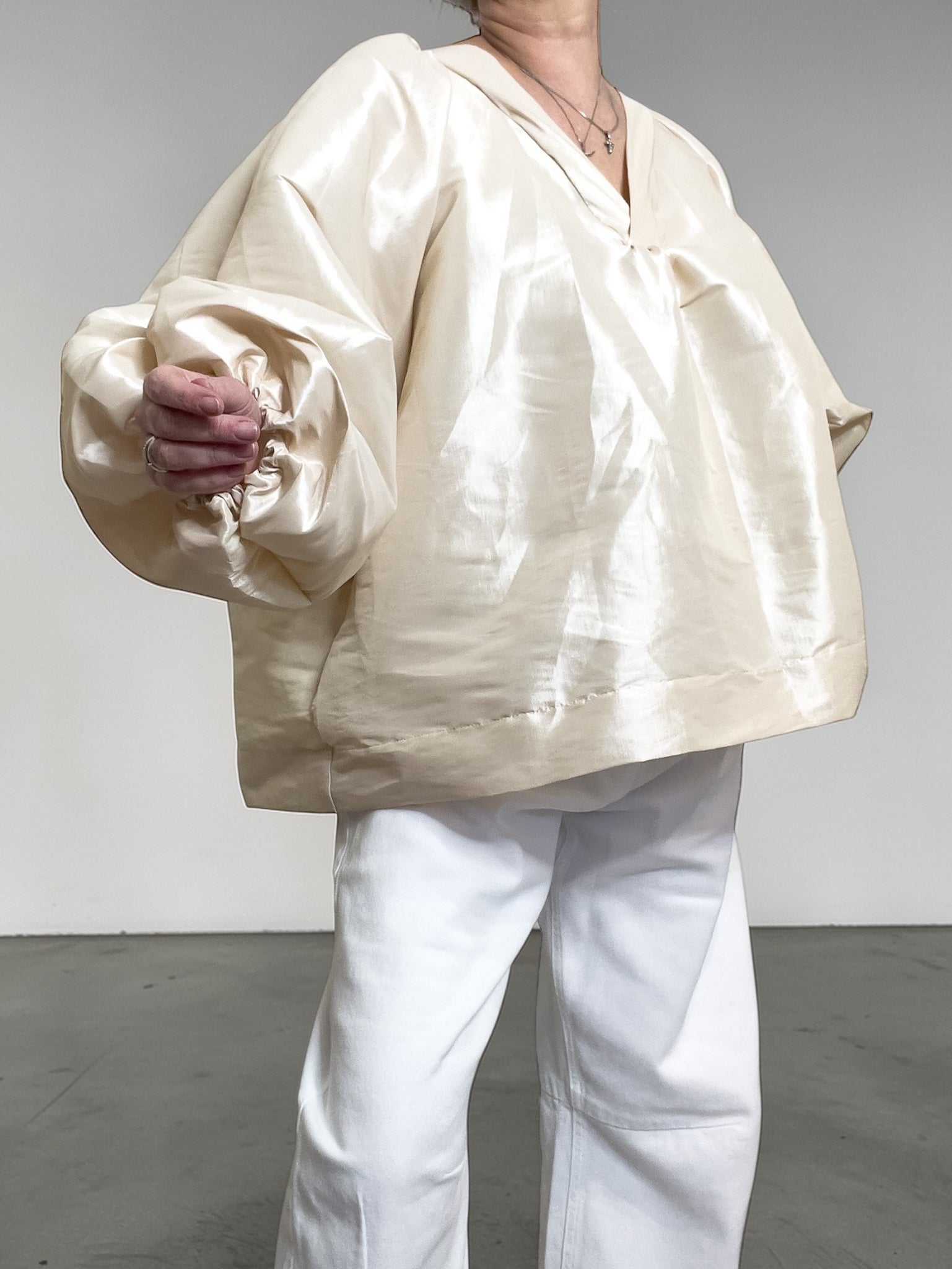 La linea è ampia, avvolgente e architettonica, con un volume morbido che si apre sul corpo senza appesantirlo. Le maniche importanti, raccolte al fondo, e il delicato effetto luminoso del tessuto rendono questo capo immediatamente riconoscibile.