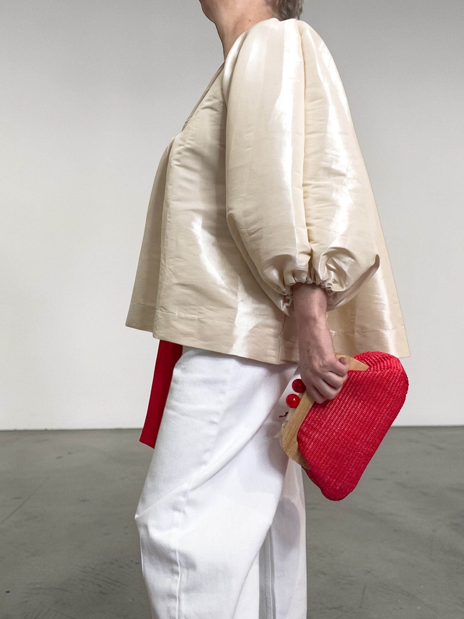 È una blusa che lavora sulla forma prima ancora che sul dettaglio: entra in un look e lo trasforma. Ha una presenza forte ma elegante, scenografica ma non teatrale. Proprio per questo può essere indossata sia in modo essenziale, con pantaloni puliti e accessori minimi e in occasione di momenti più speciali.