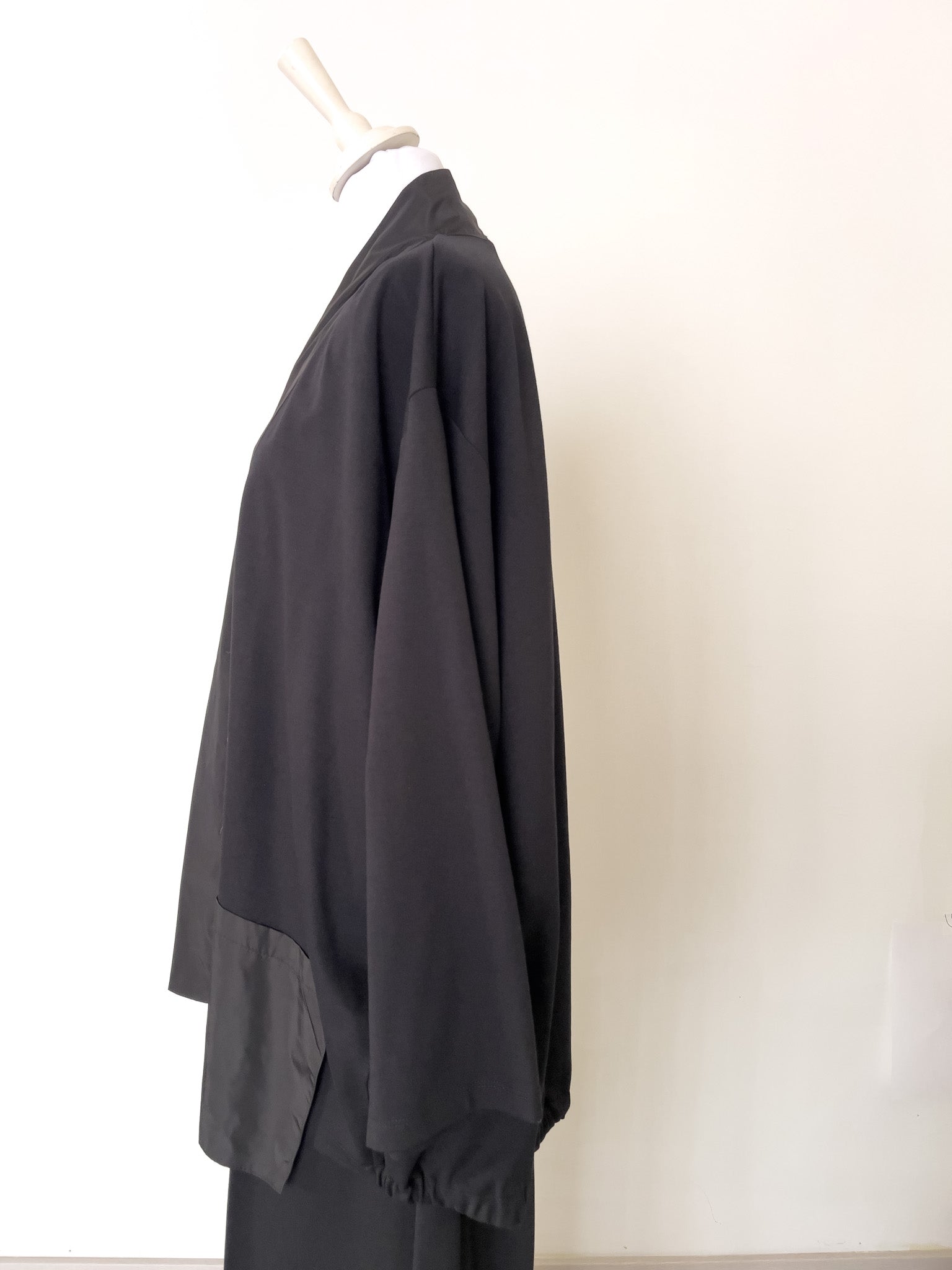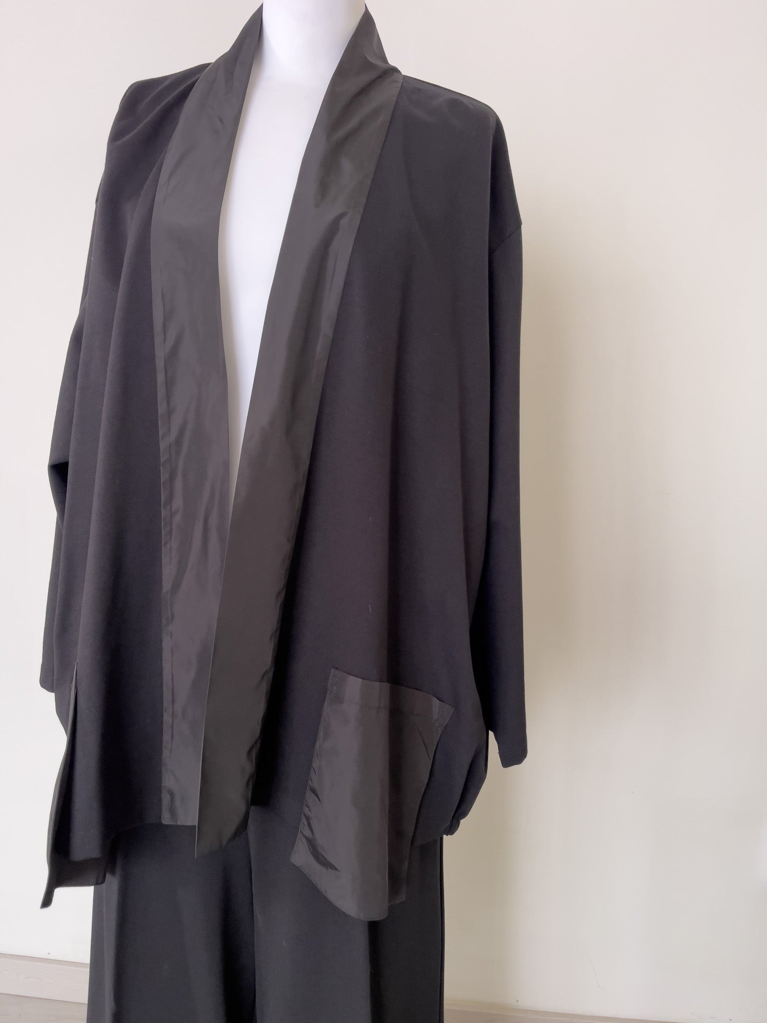 Questa giacca sciallata è un capo ibrido, pensato per accompagnare il quotidiano con leggerezza e carattere. La linea è morbida, destrutturata, priva di chiusure: si indossa aperta, lasciando che il davanti cada naturalmente lungo il corpo, creando movimento e verticalità. Fa completo con il suo pantalone morbido con inserti in tessuto tecnico.