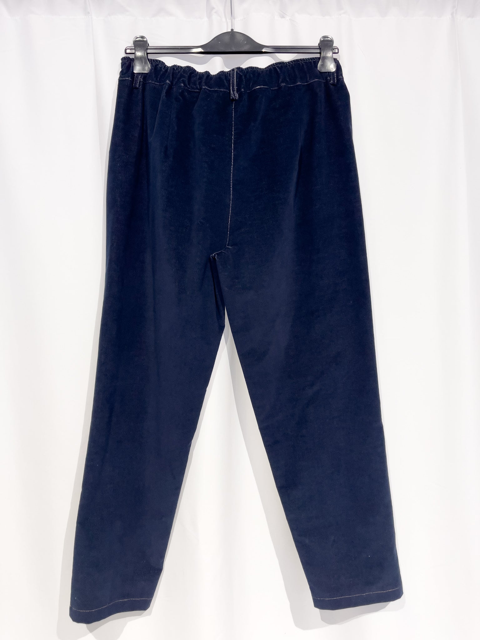 Questo pantalone in velluto blu scuro è pensato per offrire massimo comfort e una linea essenziale. La morbidezza del tessuto, leggermente elasticizzato, unita alla costruzione semplice e funzionale, crea un capo perfetto per la stagione fredda: caldo, piacevole al tatto e facile da abbinare.