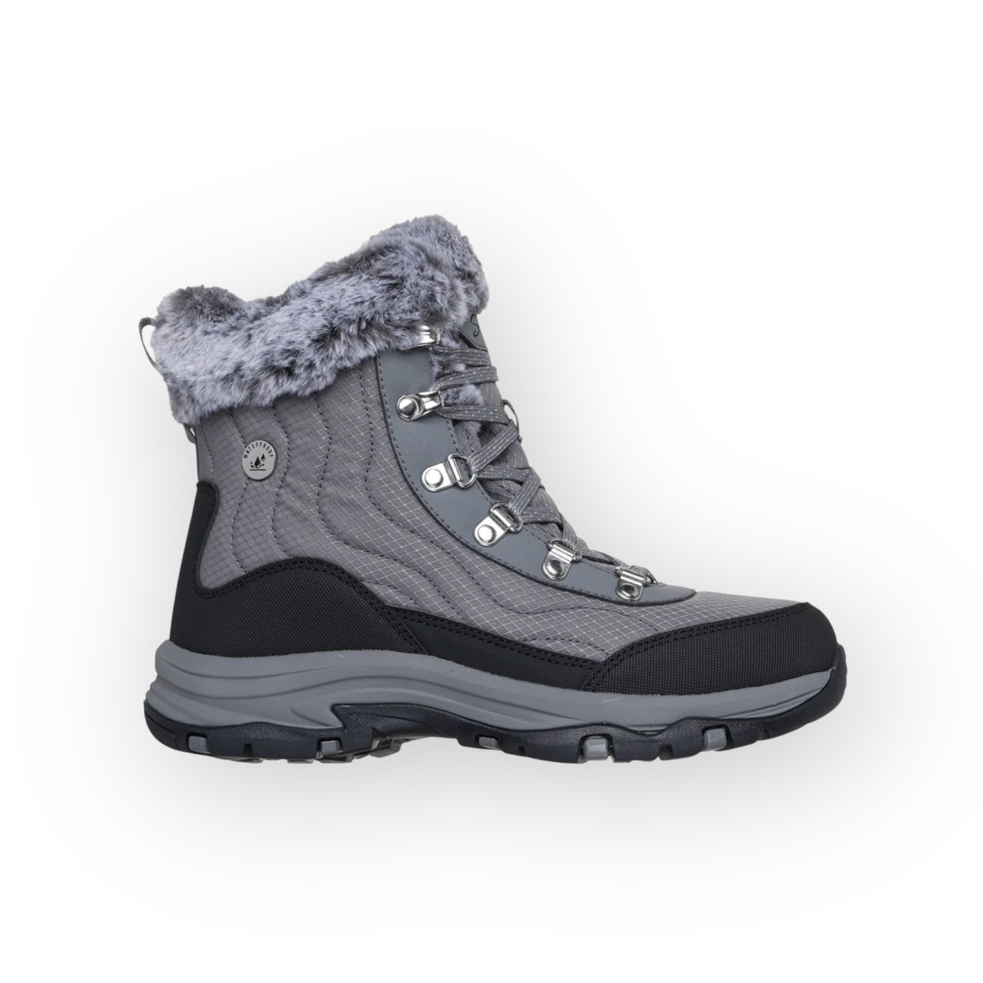Affronta l’inverno nel comfort elegante di Skechers Trego - Winter Feelings. Questo scarponcino invernale con lacci, impermeabile e antiscivolo, presenta una tomaia in tessuto trapuntato e materiale tecnico, con collo ripiegato e fodera in finta pelliccia e una soletta ammortizzata Skechers Memory Foam.