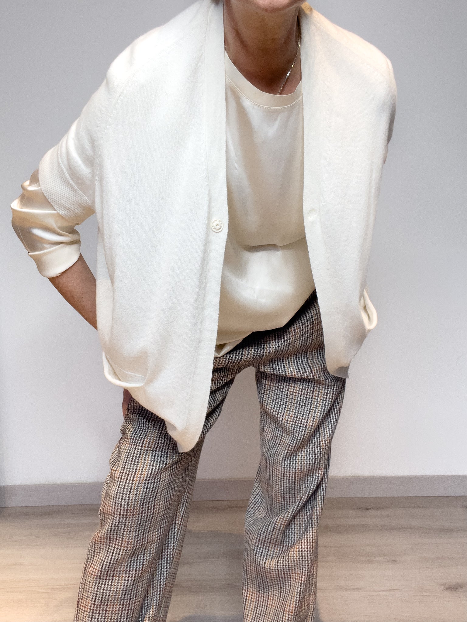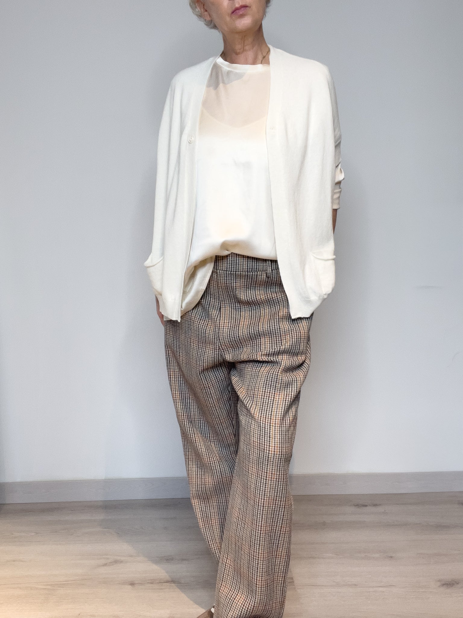 Con pantaloni in lana o Principe di Galles per un’eleganza rilassata.