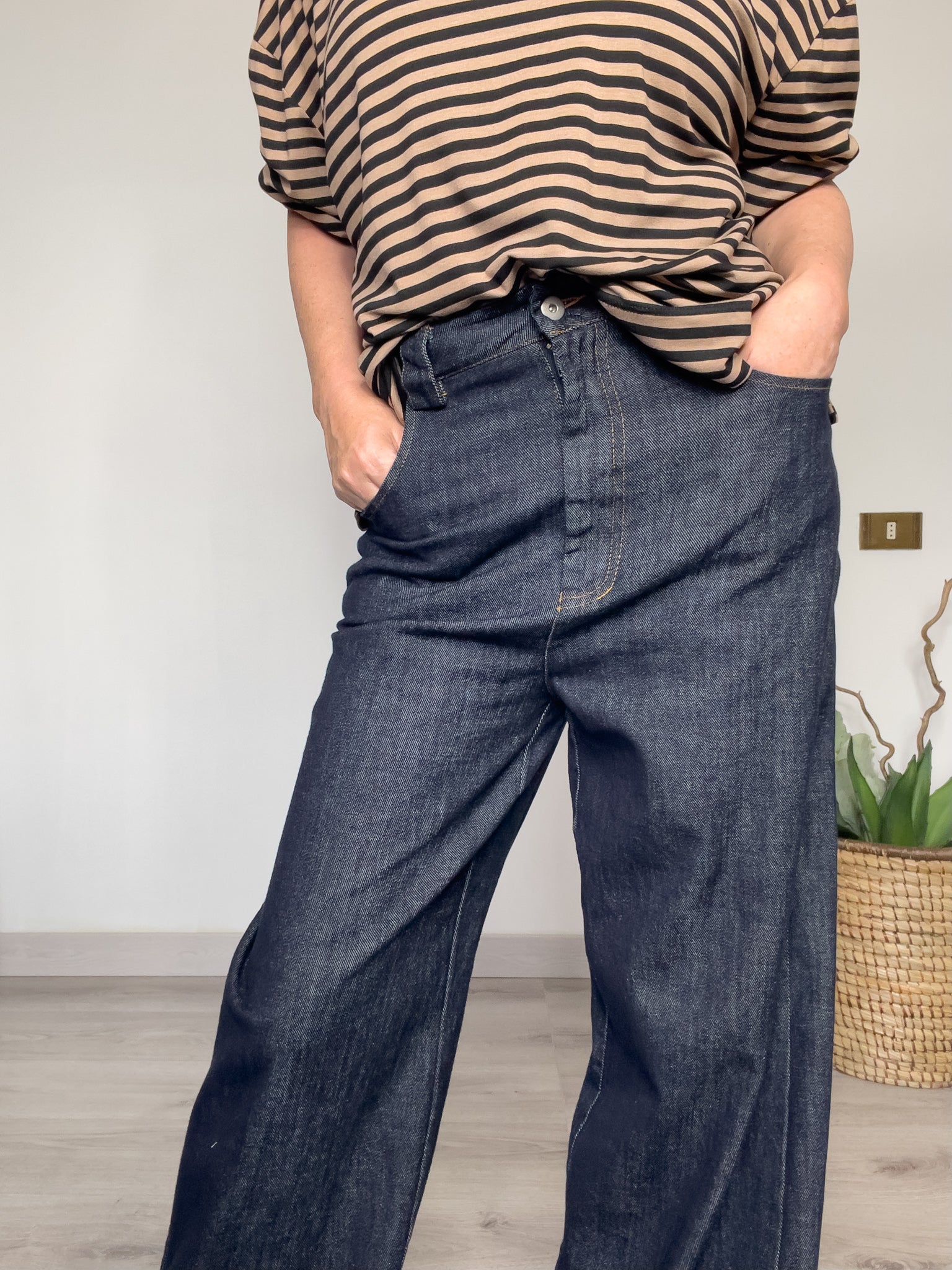 La vita alta slancia la figura, mentre la gamba ampia mantiene proporzioni armoniose senza risultare eccessiva.